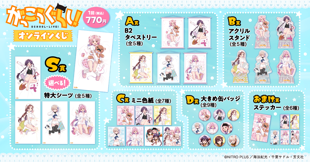 株式会社KADOKAWA(本社:東京都千代田区、取締役 代表執行役社長 CEO:夏野 剛、以下 KADOKAWA)は、運営するオンラインくじサービス「くじ引き堂」において、「がっこうぐらし! 」の豪華賞品が手に入る<がっこうぐらし! オンラインくじ>を、2026年1月29日(木)12時より販売します。