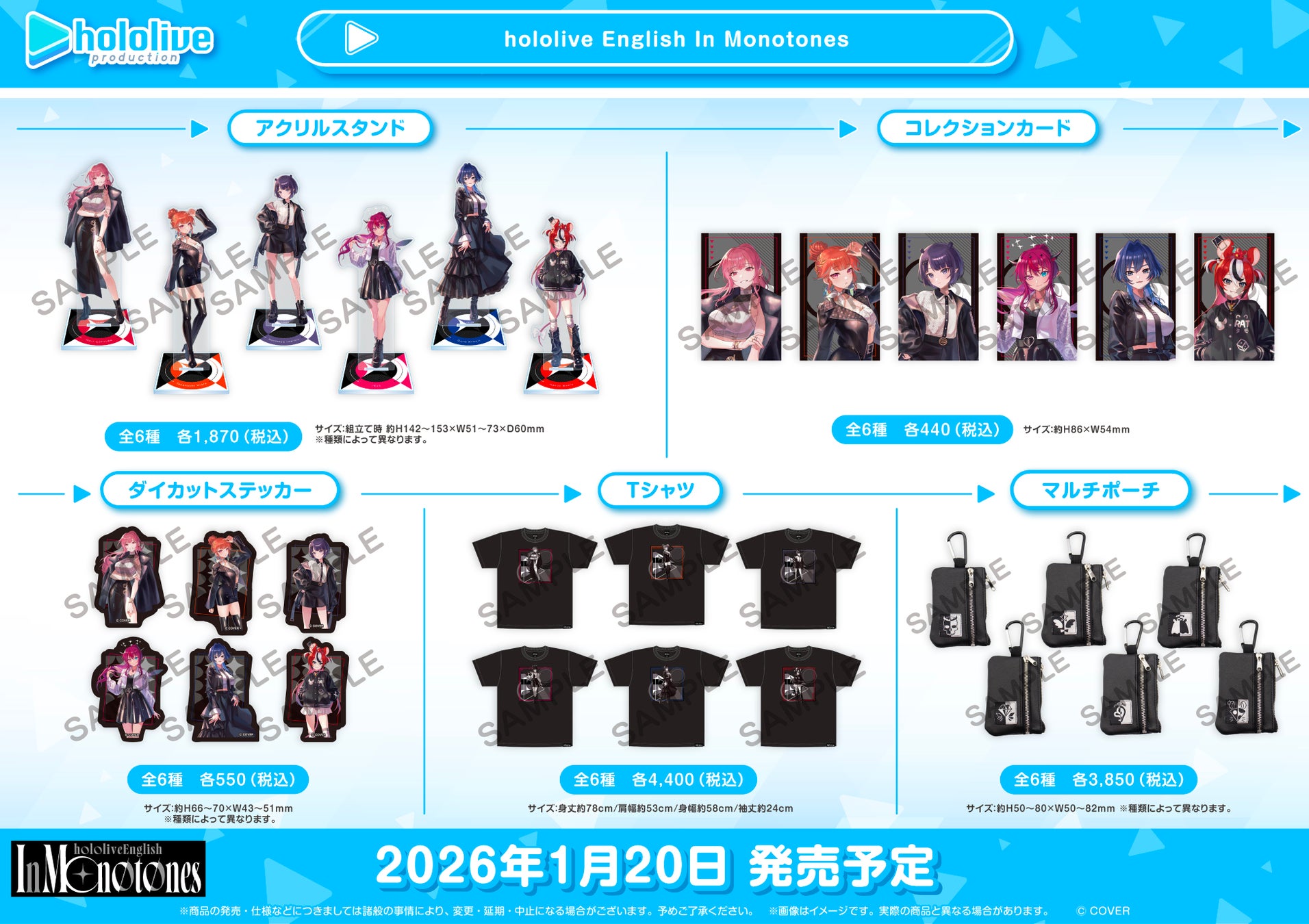 ①『ホロライブEnglish』のメンバーがモノトーンカラーを基調とした装いでデザインされた「hololive English In Monotones」商品を現在ご案内中です。