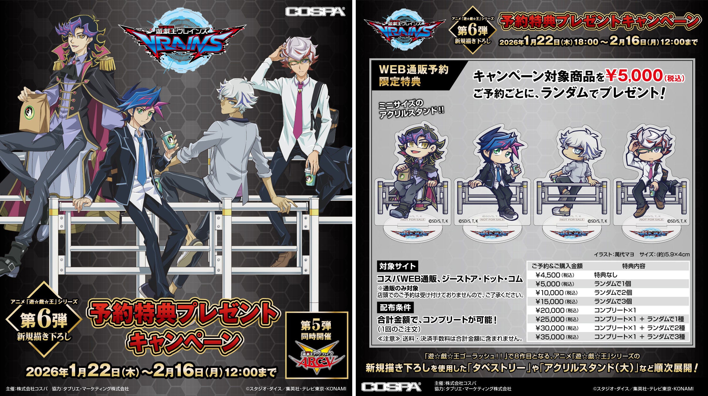 公式キャラクターコスチュームやアパレル・グッズの企画、開発、製造を行う株式会社コスパは『遊☆戯☆王ARC-V』『遊☆戯☆王VRAINS』新グッズ・予約特典キャンペーンを発表した。