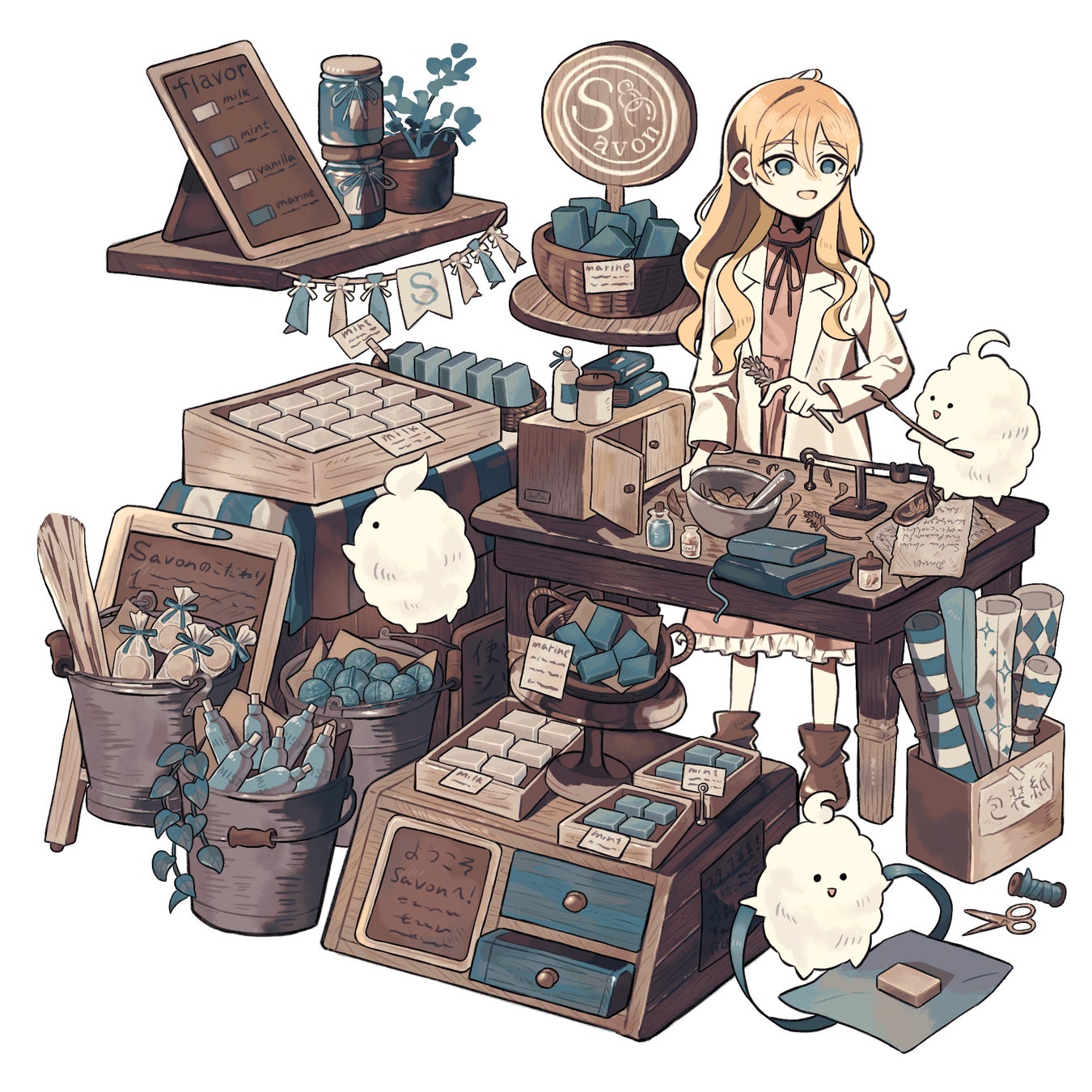 石鹸屋さんという設定がとてもユニークで、本当にお店に行ってみたくなる魅力があります。シックで落ち着いた配色でまとめられていながら、自然に女の子に視線がいく構成がいいですね。いろんなフレーバーの手作り石けんが並べられていて、お店全体に良い香りが漂っていそうです。泡の妖精たちが働いている姿からお店の賑やかさと温かみが伝わってきて、親しみやすく可愛らしい一枚です。