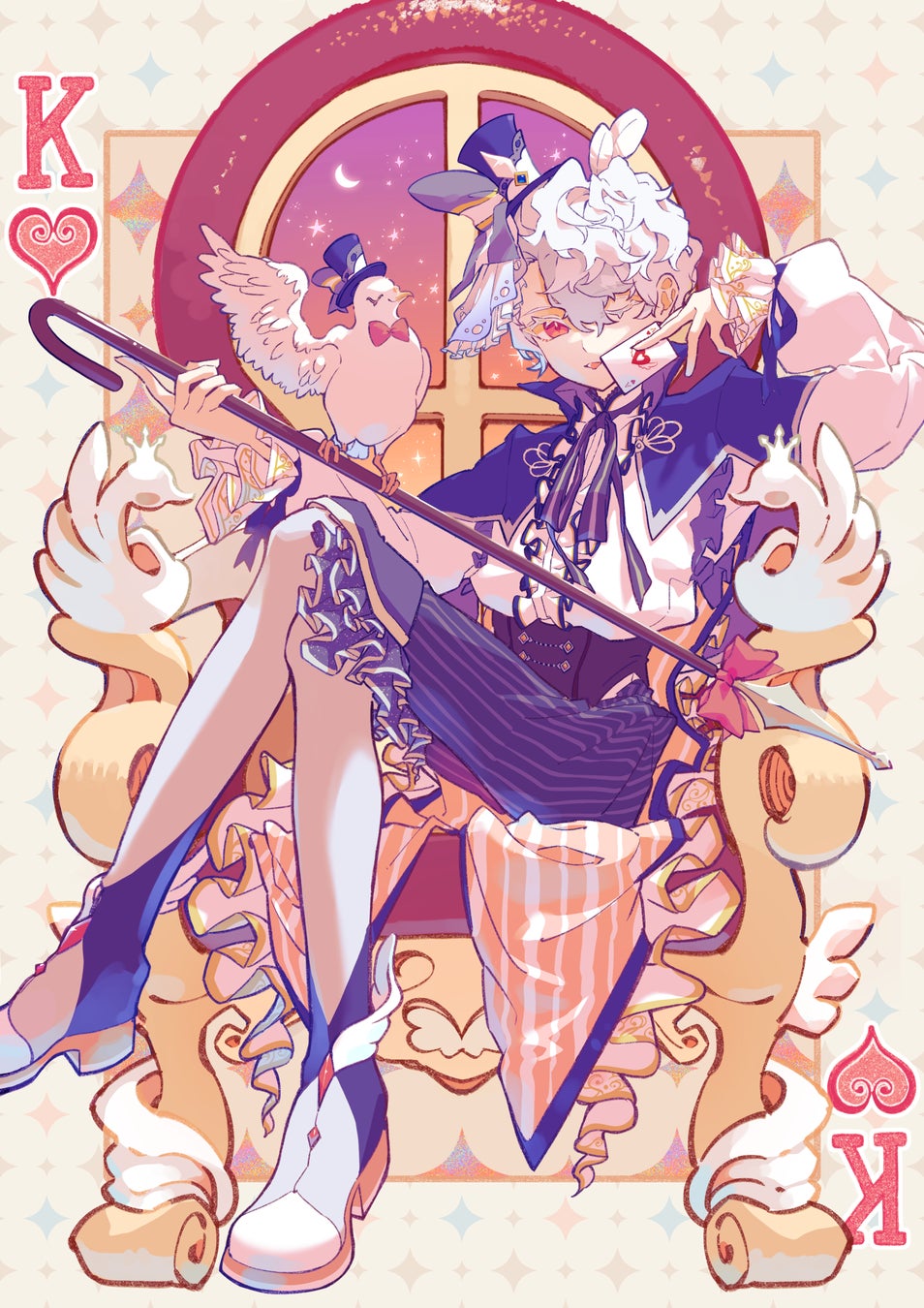 ひと目見ただけで作者の「好き」がダイレクトに伝わってくる、完成度の高い作品です。ご自身の好みがふんだんに盛り込まれており、「描くのが楽しい!」という前向きな気持ちが画面全体から感じられます。トランプを模したレイアウトやキャラクターデザイン、装飾の華やかさがとても豪華で印象的です。特にモチーフの選び方・取り入れ方が洗練されていて、鳥やトランプの要素が自然に溶け込んでいます。線画がアナログっぽい質感になっていることにより、どこかお伽話っぽい雰囲気なところも素敵です。構図が若干のアオリになっていることでカッコ可愛い雰囲気も演出できていて、1枚絵としてとてもクオリティが高く綺麗にまとまったイラストですね!