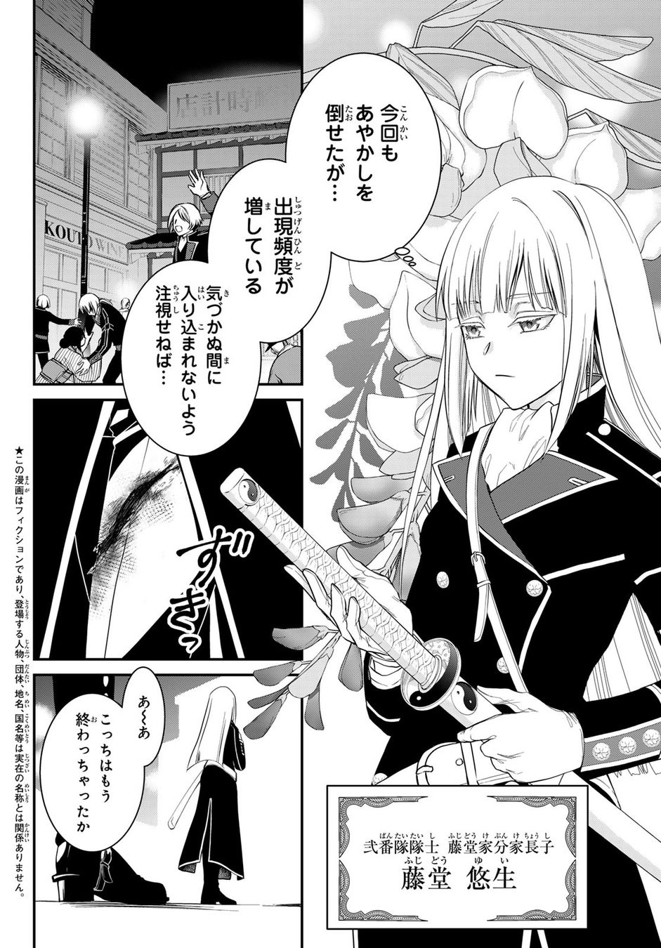 陰陽寮弐番隊副隊長・青樹志苑(あおきしおん)と、隊士・藤堂悠生(ふじどうゆい)。