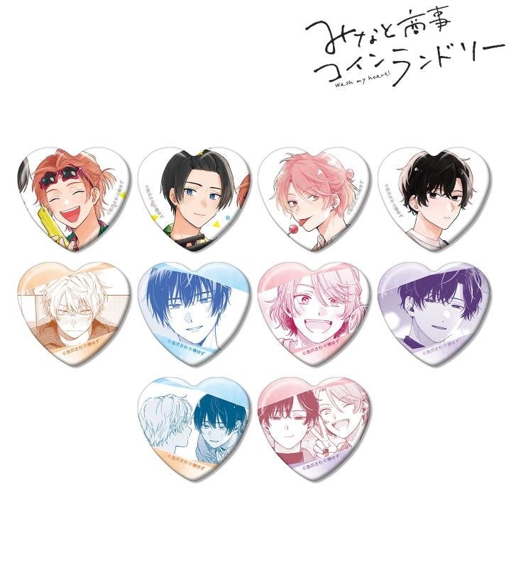 湊 晃、香月 慎太郎、英 明日香、佐久間 柊のカラーイラスト、原作コマをハート型の缶バッジに仕上げました。