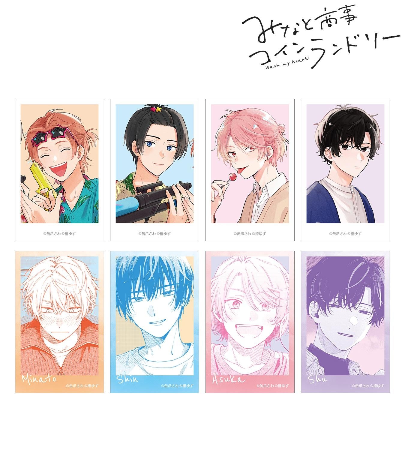 湊 晃、香月 慎太郎、英 明日香、佐久間 柊のカラーイラスト、原作コマをインスタントカメラ風のイラストカードに仕上げました。