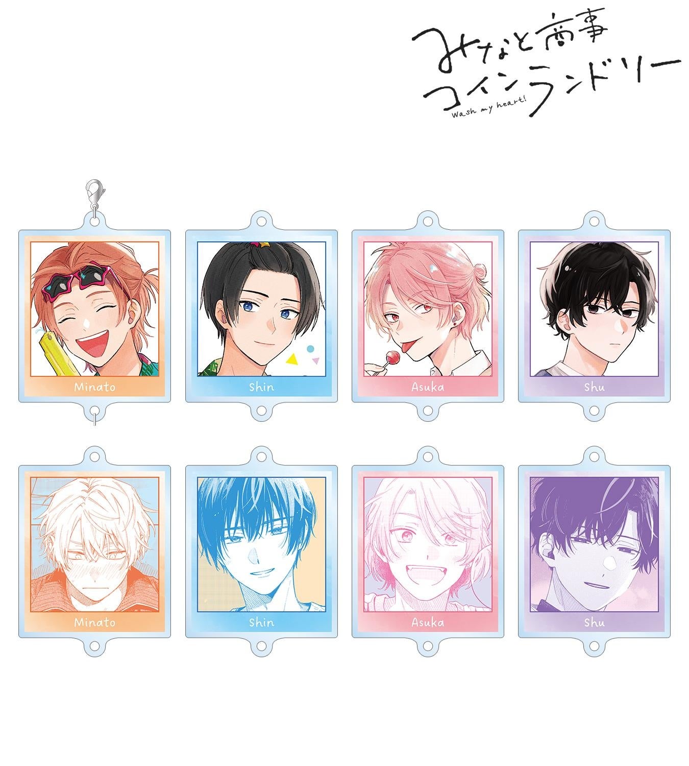 湊 晃、香月 慎太郎、英 明日香、佐久間 柊のカラーイラスト、原作コマをカニカンとマルカンでつなげることのできるアクリルキーホルダーに仕上げました。