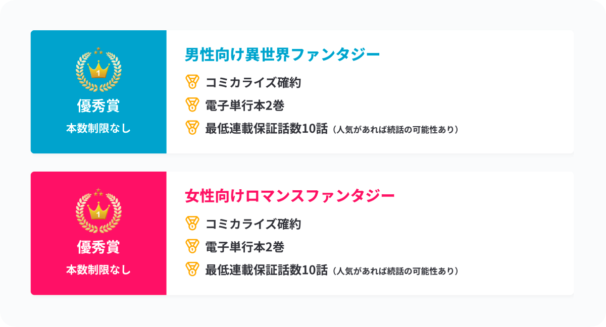 男性向け異世界ファンタジーおよび女性向けロマンスファンタジーの2ジャンルを対象に、企画力・作品力を重視してGG-COMICS編集部が審査を行います。