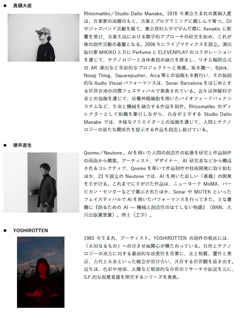 『攻殻機動隊』30周年モーションロゴを手がけたYOSHIROTTENと、国際的な舞台で評価を受ける真鍋大度が共演。光と映像を主軸に、作品世界を“視覚のレイヤー”から再構成します。