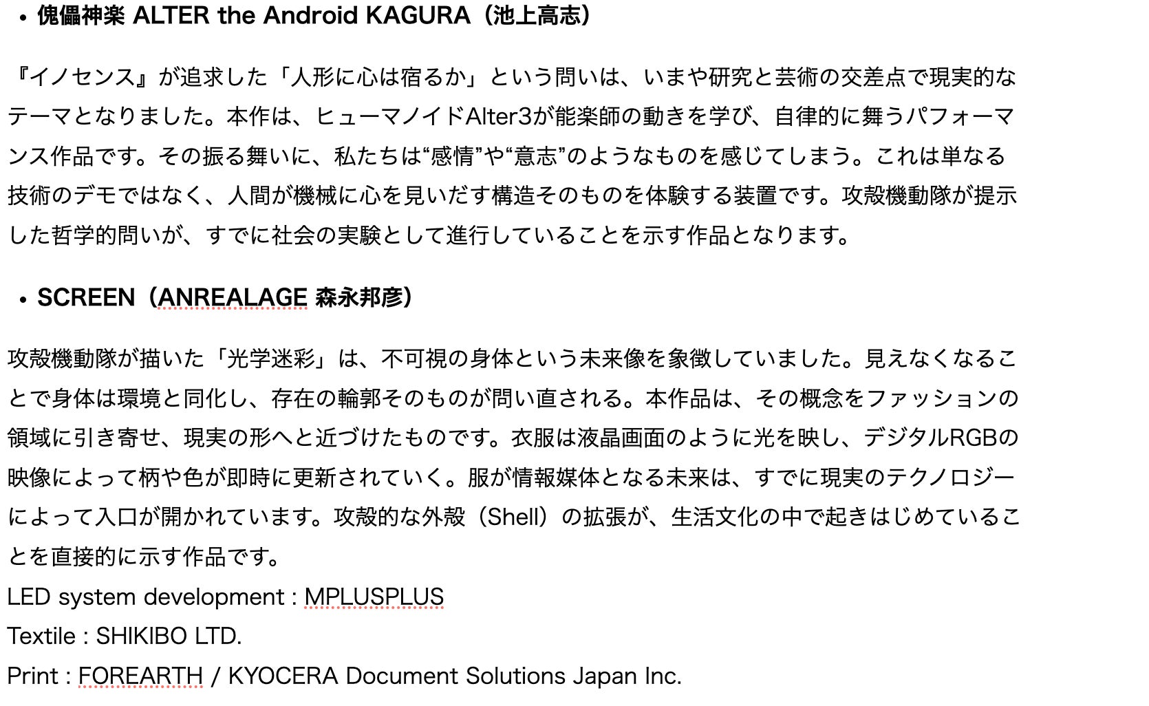 攻殻機動隊展 Ghost and the Shell 製作委員会 株式会社講談社 森ビル株式会社 KDDI株式会社 株式会社プロダクション・アイジー 株式会社パルコ 株式会社バンダイナムコフィルムワークス |
