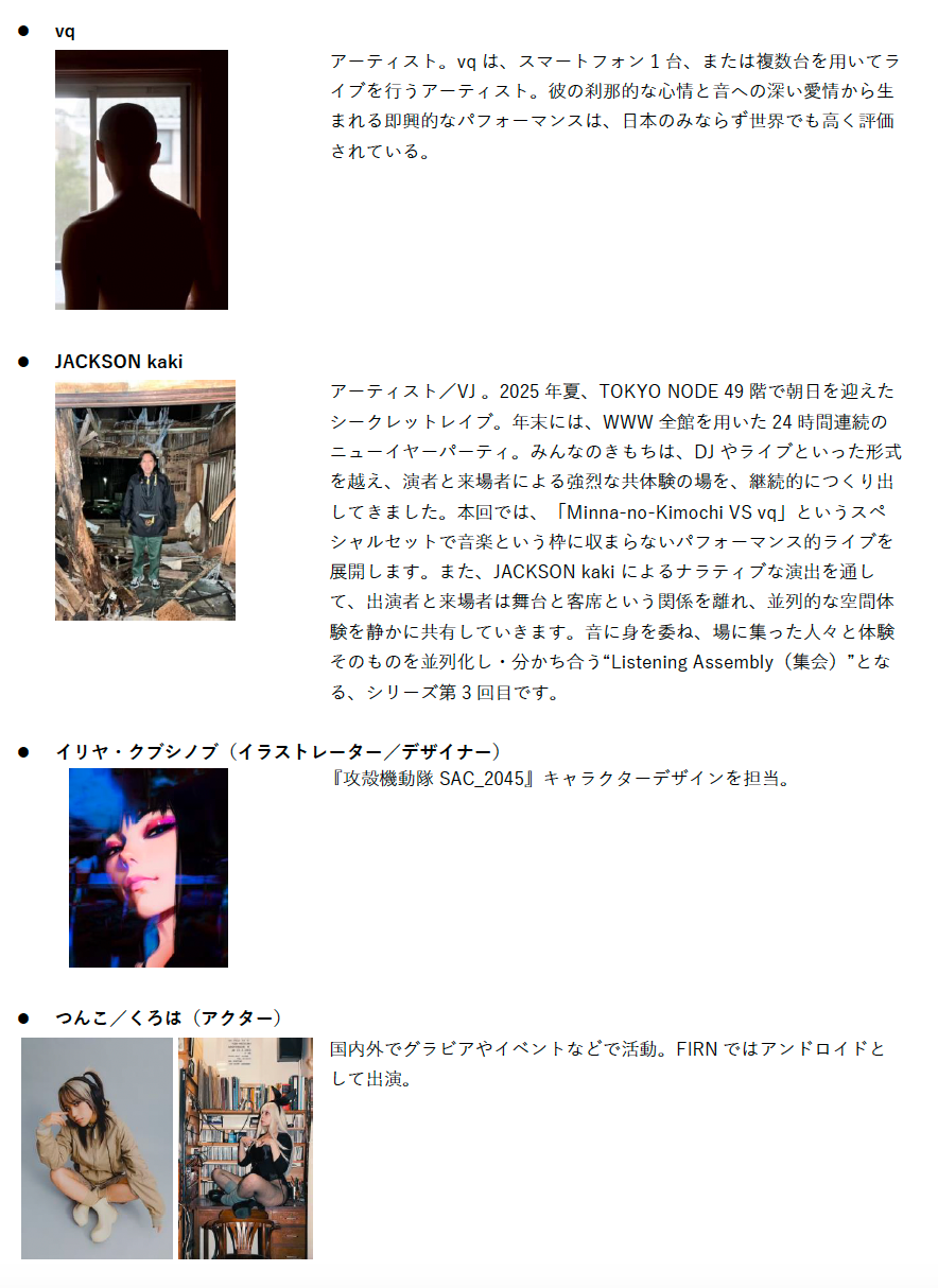 架空のFIRNが立ち上がる最初の夜。『攻殻機動隊』の音楽的原点である川井憲次の系譜と、その影響下にある音楽家たちが交差し、本企画の“原初”となる音の風景を描き出します。