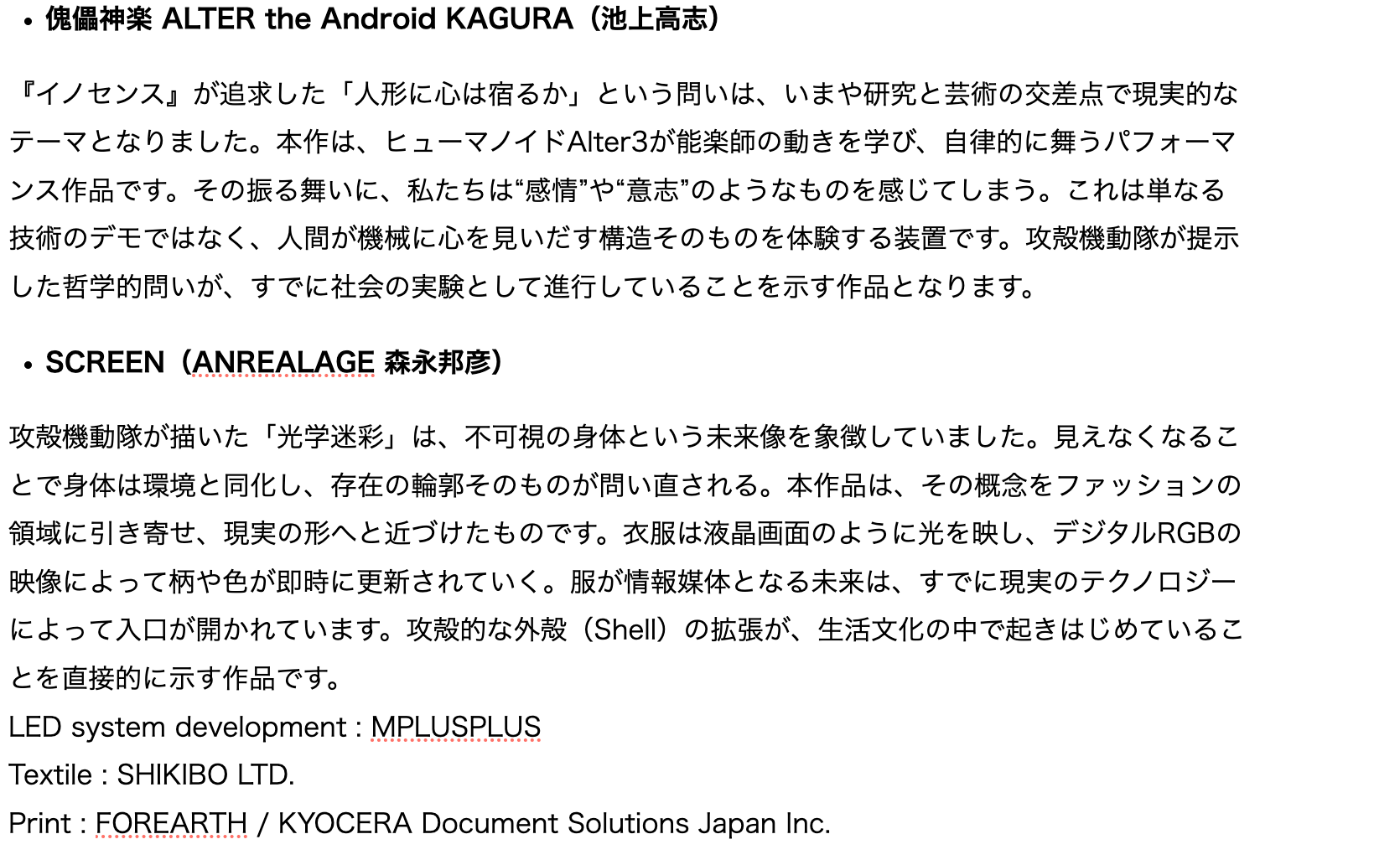 攻殻機動隊展 Ghost and the Shell 製作委員会 株式会社講談社 森ビル株式会社 KDDI株式会社 株式会社プロダクション・アイジー 株式会社パルコ 株式会社バンダイナムコフィルムワークス |
