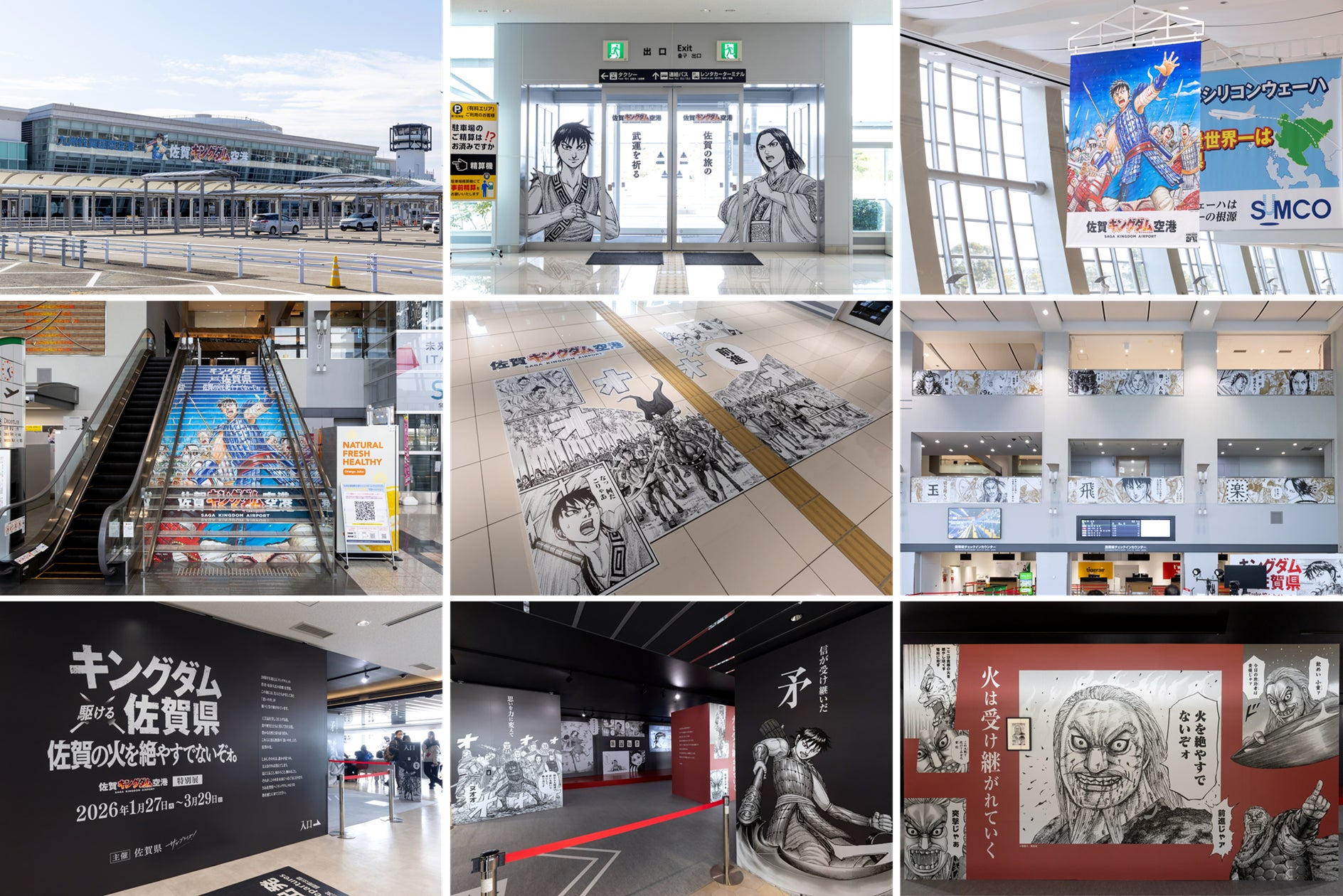また、期間中は空港で働くスタッフが本コラボオリジナルの「ピンバッジ」を着用して業務にあたり、空港全体が“チーム佐賀キングダム空港”として来訪者を迎えます。空港3階で開催している「佐賀キングダム空港特別展」では、信が託された「夢」や王騎将軍から受け継いだ「矛」など、物語の核となる「思いの継承」をテーマにした特別展を開催。ファン必見の内容となっています。