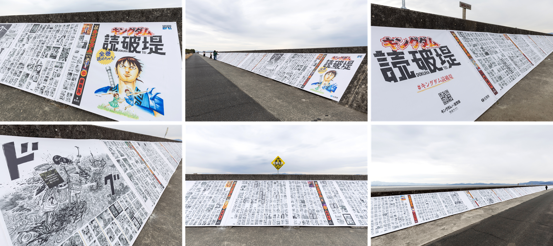 セレモニー後の現地取材会では、有明海沿いの防波堤に設置された「キングダム読破堤」を披露しました。コミックス1巻から77巻までの全ページが300m超にわたって続く光景は圧巻。