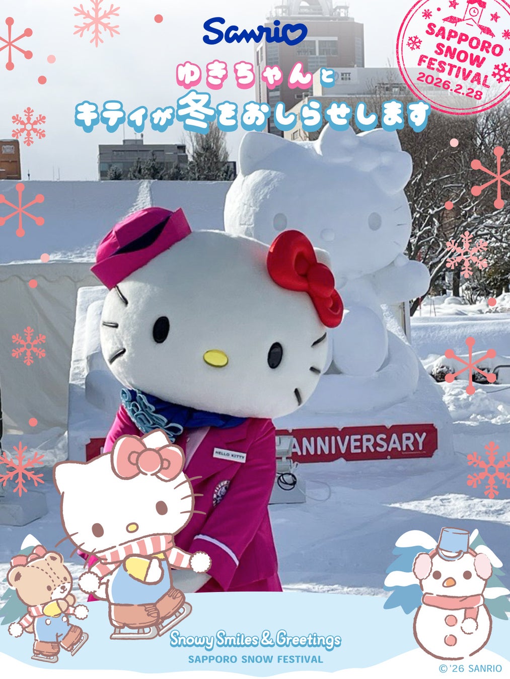 2月4日(水)と6日(金)の2日間は、ふわふわの雪にさそわれてハローキティとポムポムプリンがさっぽろ雪まつりへごあいさつをしに来場!