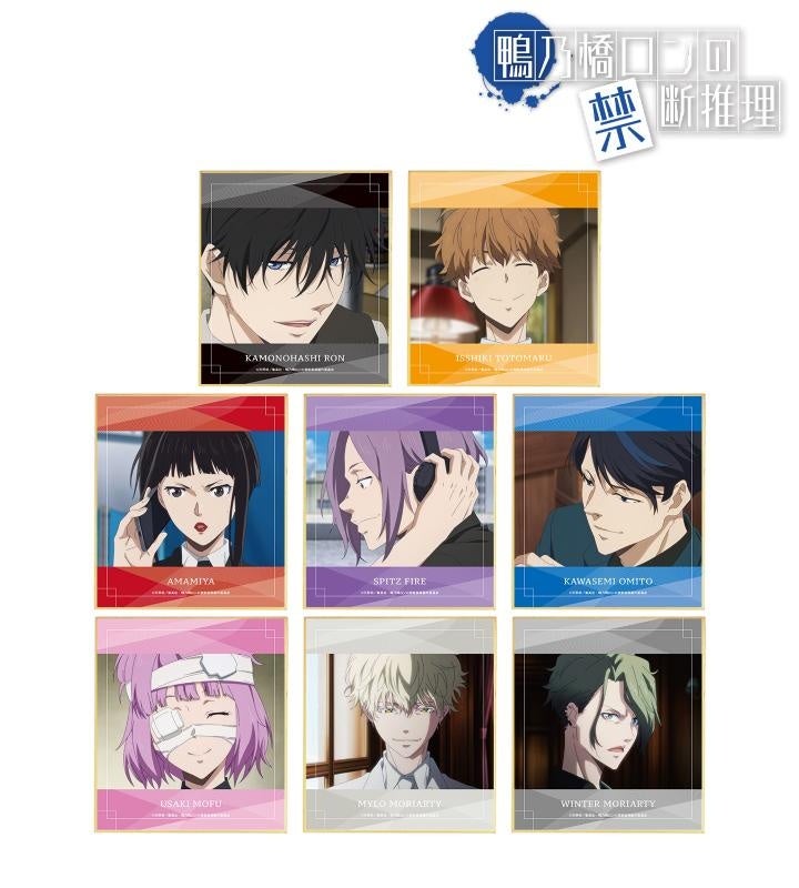 鴨乃橋ロン、一色都々丸、雨宮、シュピッツ・ファイア、翡翠臣疾、卯咲もふ、マイロ・モリアーティ、ウィンター・モリアーティの印象的なシーンをミニ色紙に仕上げました。