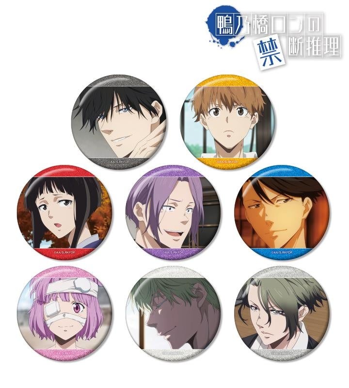 鴨乃橋ロン、一色都々丸、雨宮、シュピッツ・ファイア、翡翠臣疾、卯咲もふ、マイロ・モリアーティ、ウィンター・モリアーティの印象的なシーンをグリッター加工を施した缶バッジに仕上げました。