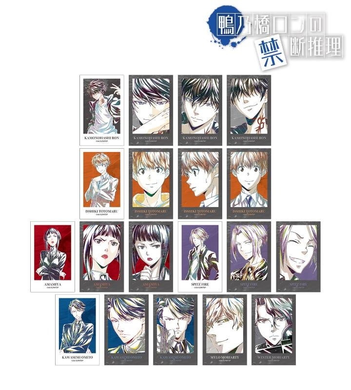 鴨乃橋ロン、一色都々丸、雨宮、シュピッツ・ファイア、翡翠臣疾、マイロ・モリアーティ、ウィンター・モリアーティのイラストを新たなタッチで魅力的に表現し、ブロマイドに仕上げました。
