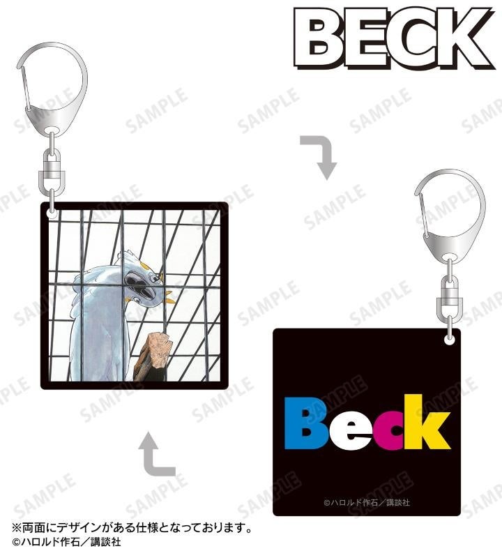 ペイジ、ベック、田中幸雄、南 竜介、千葉 恒美、平 義行、桜井 裕志のイラスト、BECKの描き起こしロゴを両面貼り合わせアクリルキーホルダーに仕上げました。