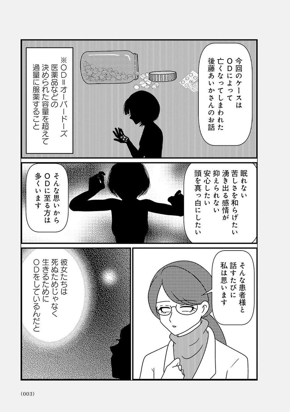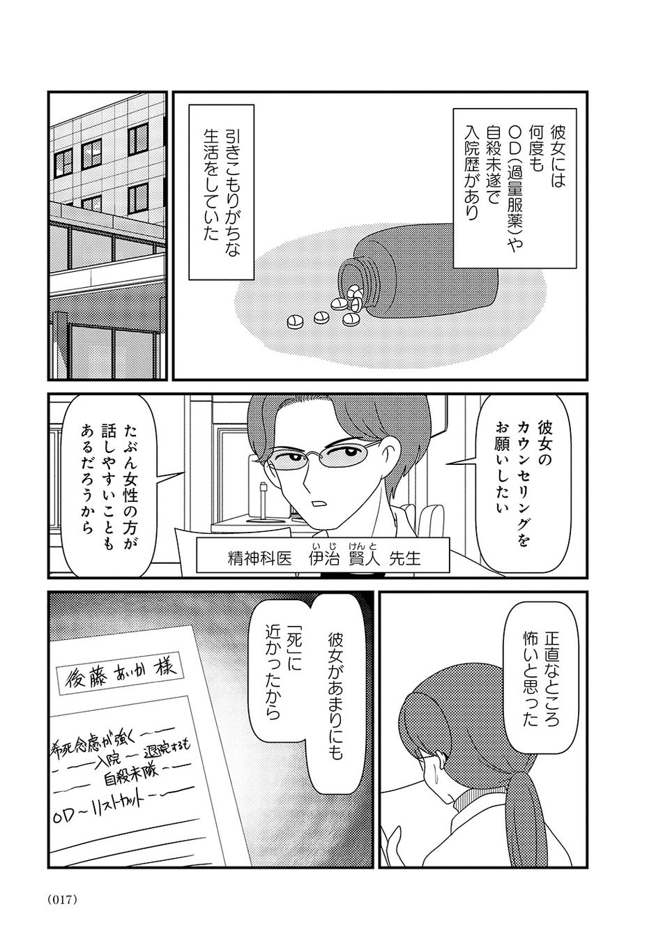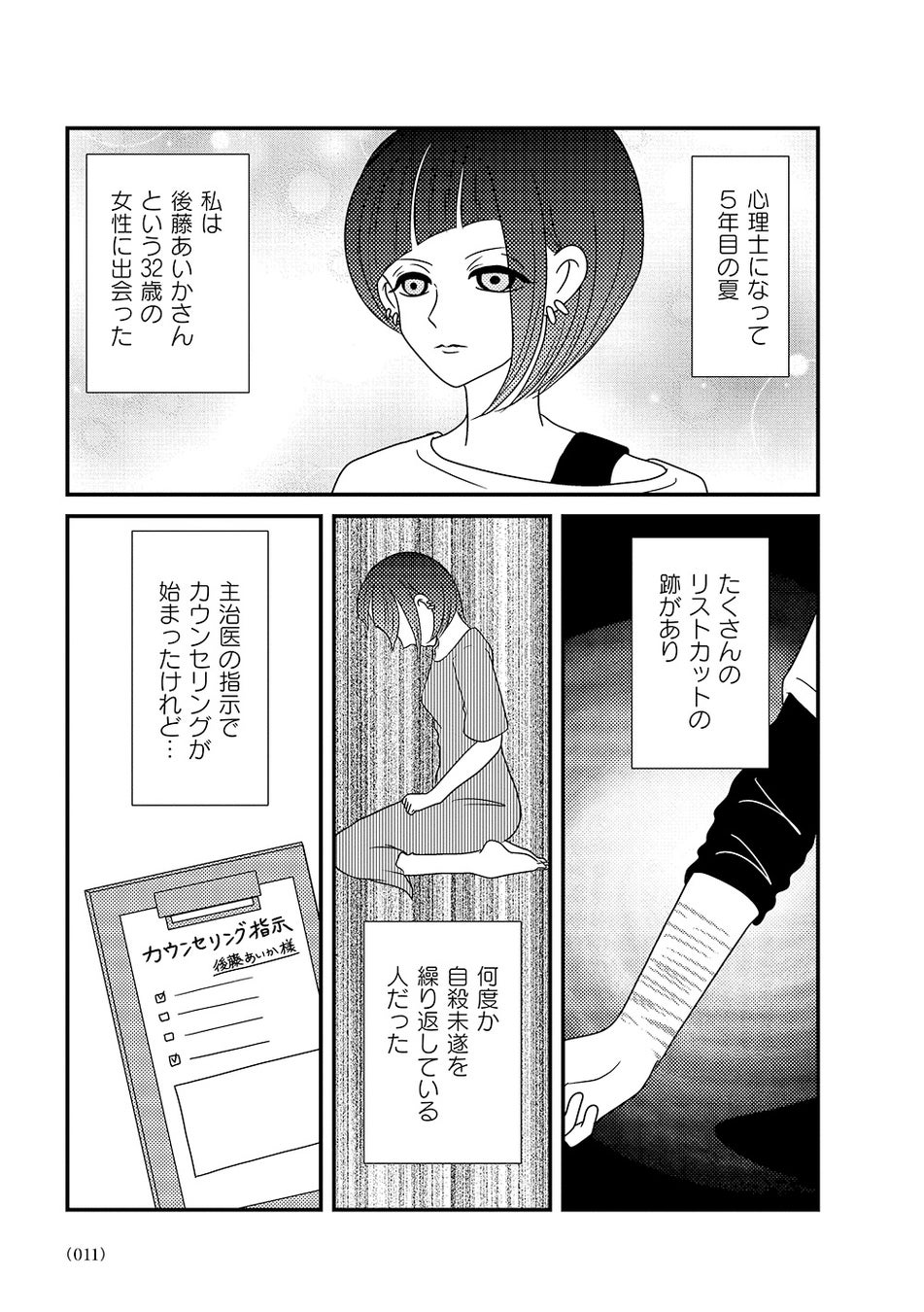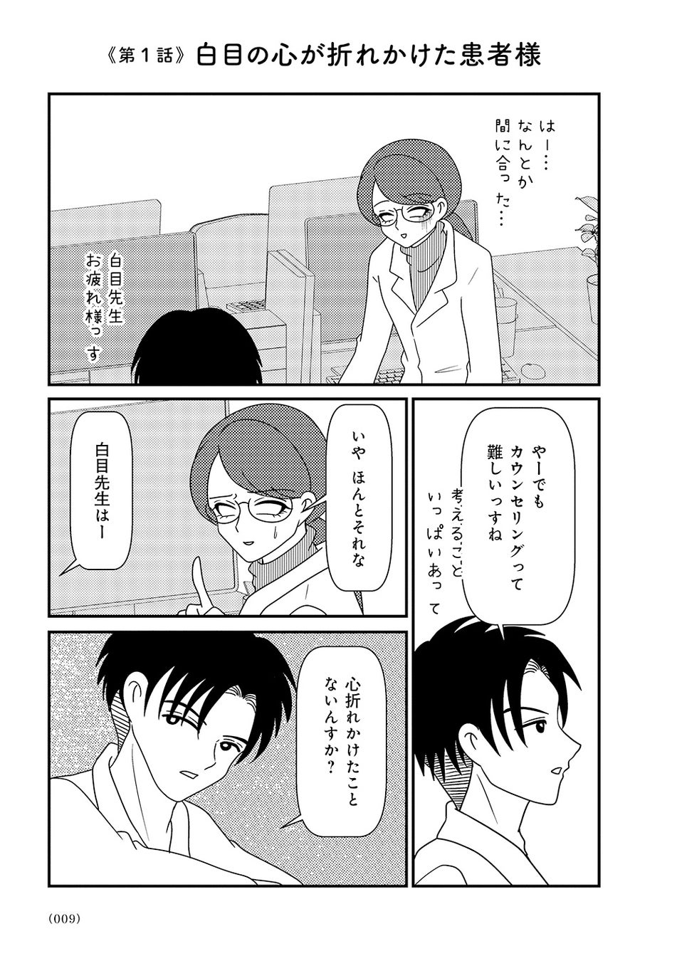 オーバードーズ(薬の過剰摂取)と自殺未遂を繰り返す患者様とのカウンセリングは先行きが見えず、担当心理士の白目みさえは思い悩んでいた。唯一の希望は患者様がカウンセリングを拒否したり、無断キャンセルしたりすることがないこと。辛抱づよくカウンセリングを続ける患者様と白目との間で、少しずつ会話が増えていく。