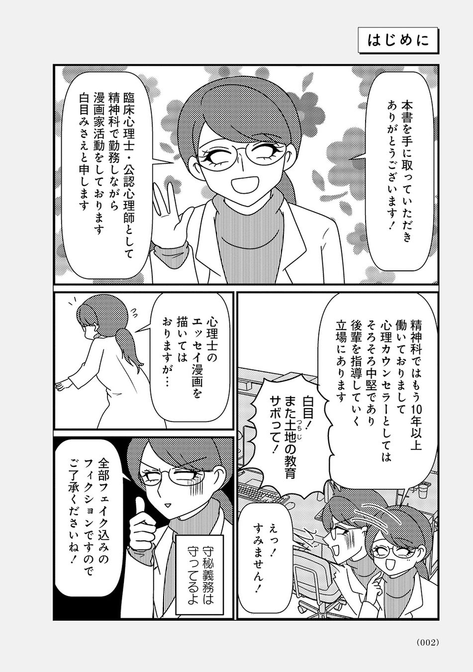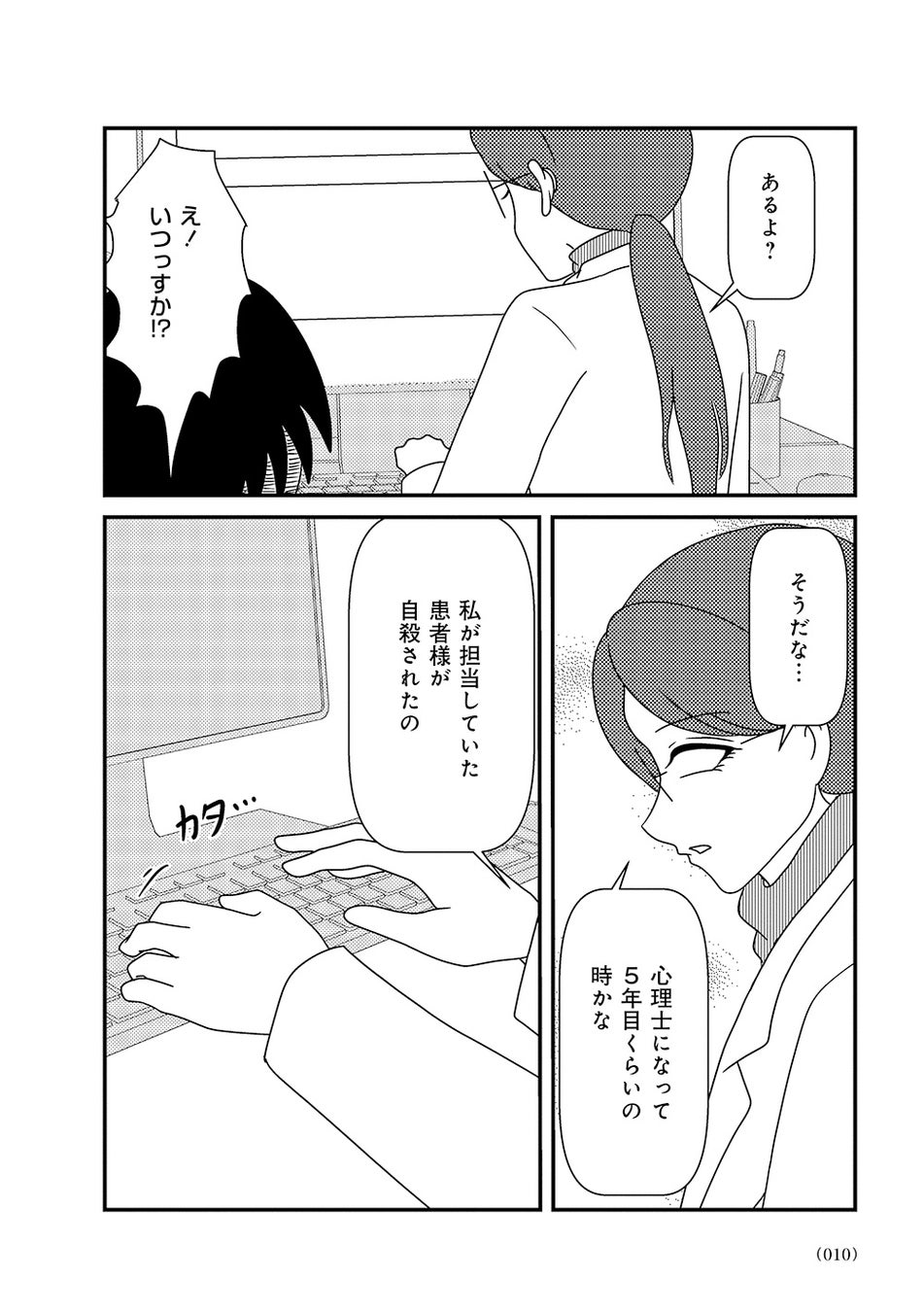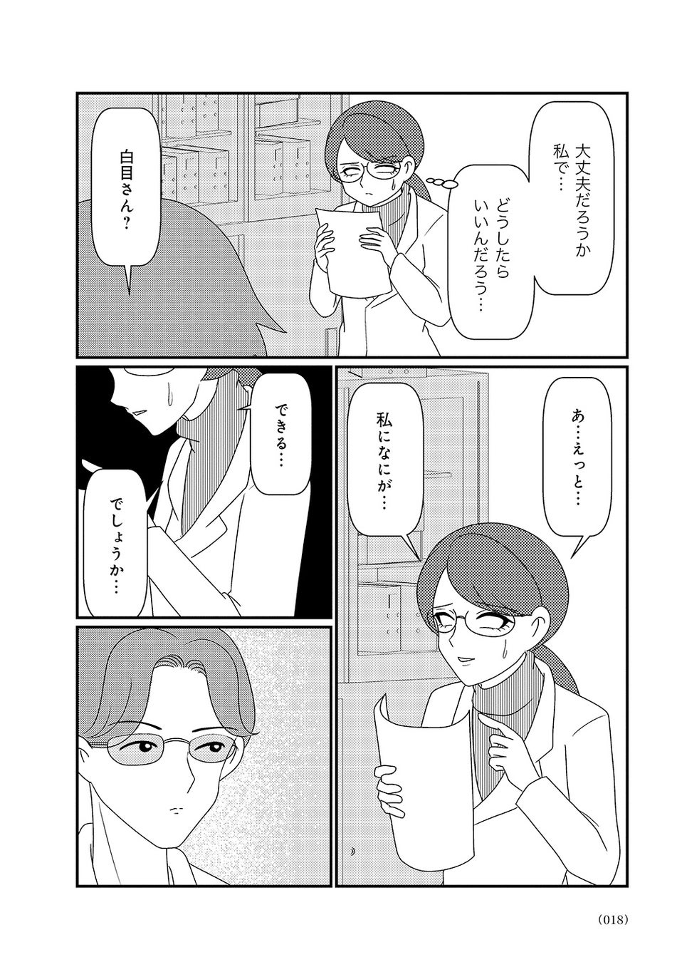 オーバードーズ(薬の過剰摂取)と自殺未遂を繰り返す患者様とのカウンセリングは先行きが見えず、担当心理士の白目みさえは思い悩んでいた。唯一の希望は患者様がカウンセリングを拒否したり、無断キャンセルしたりすることがないこと。辛抱づよくカウンセリングを続ける患者様と白目との間で、少しずつ会話が増えていく。