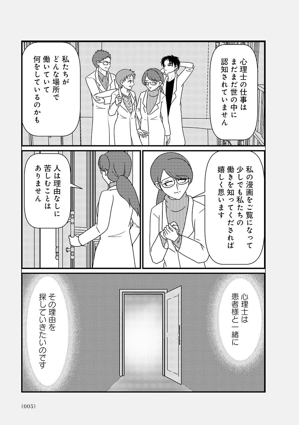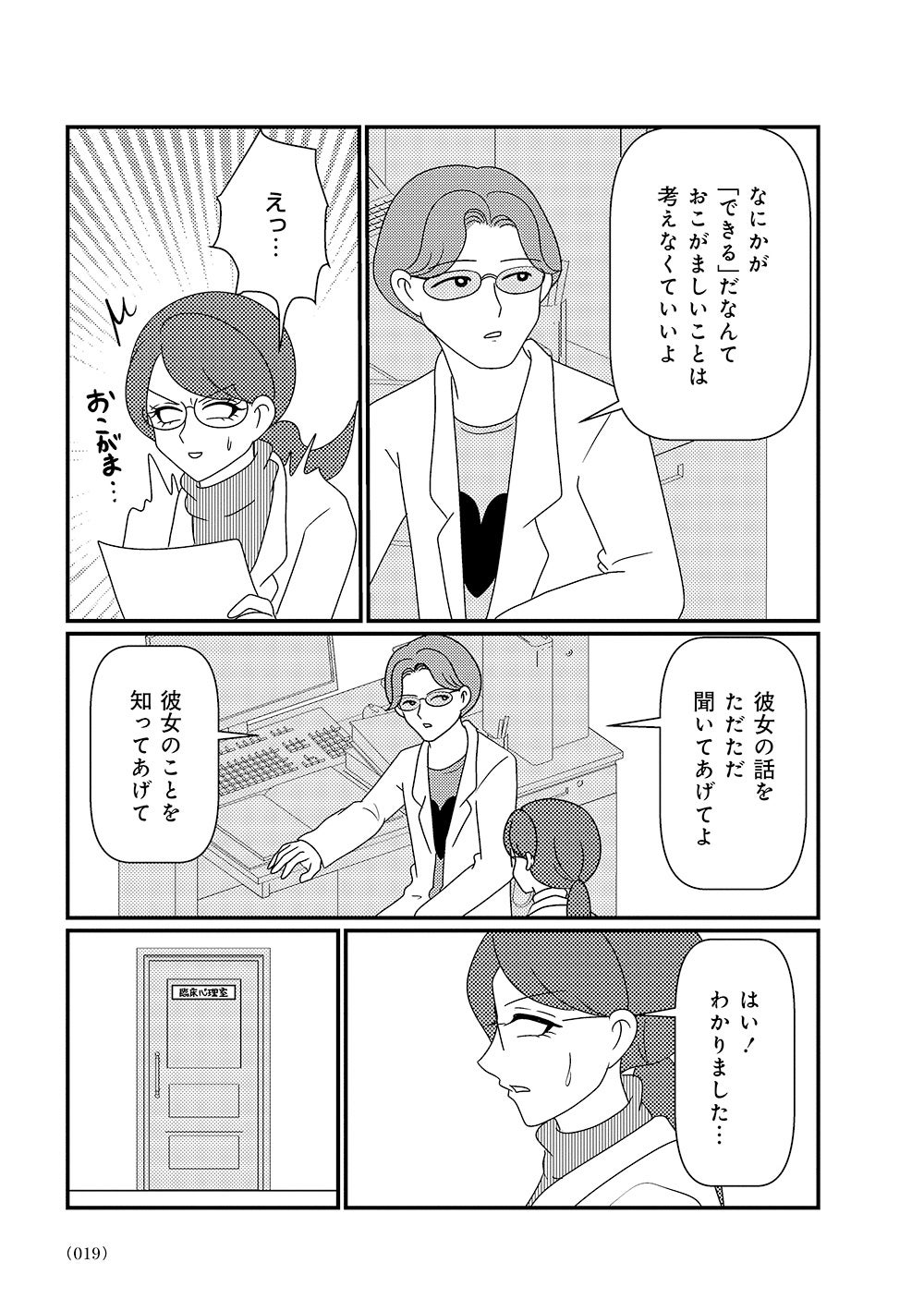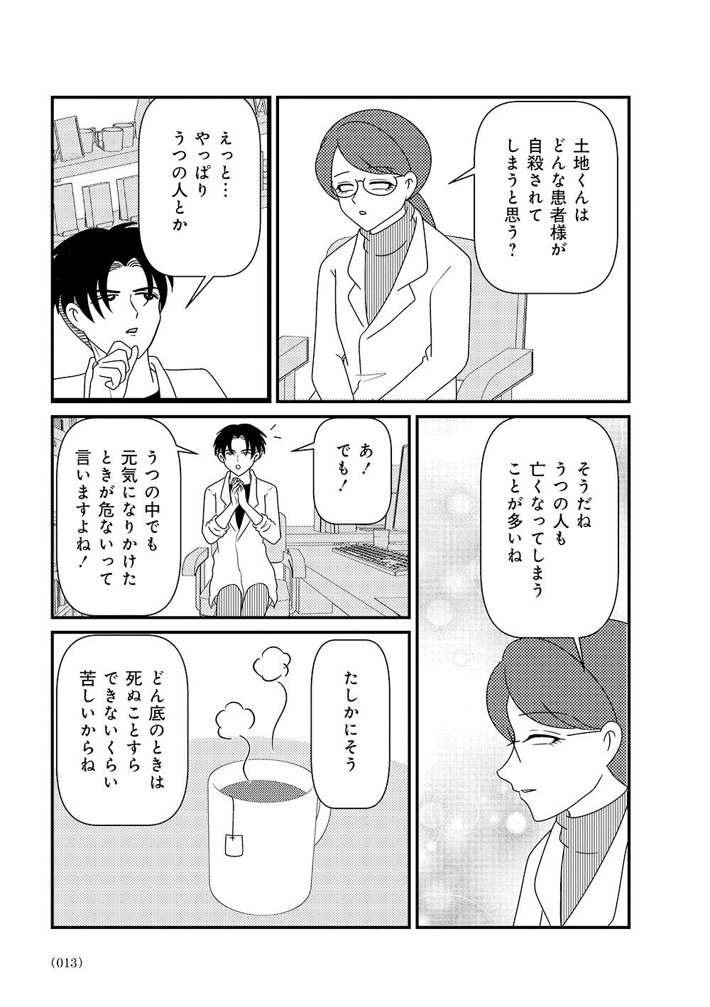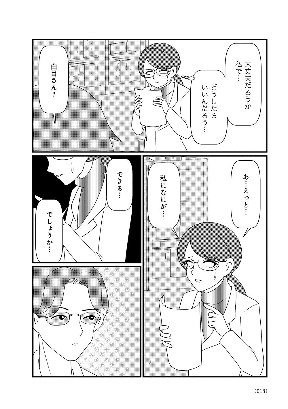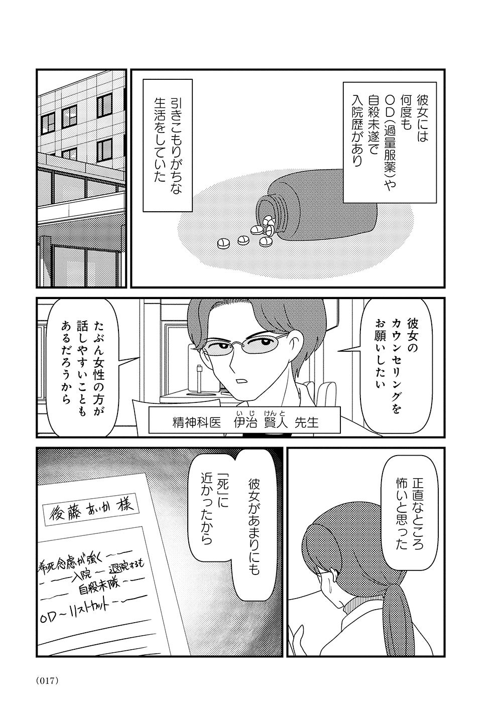 オーバードーズ(薬の過剰摂取)と自殺未遂を繰り返す患者様とのカウンセリングは先行きが見えず、担当心理士の白目みさえは思い悩んでいた。唯一の希望は患者様がカウンセリングを拒否したり、無断キャンセルしたりすることがないこと。辛抱づよくカウンセリングを続ける患者様と白目との間で、少しずつ会話が増えていく。