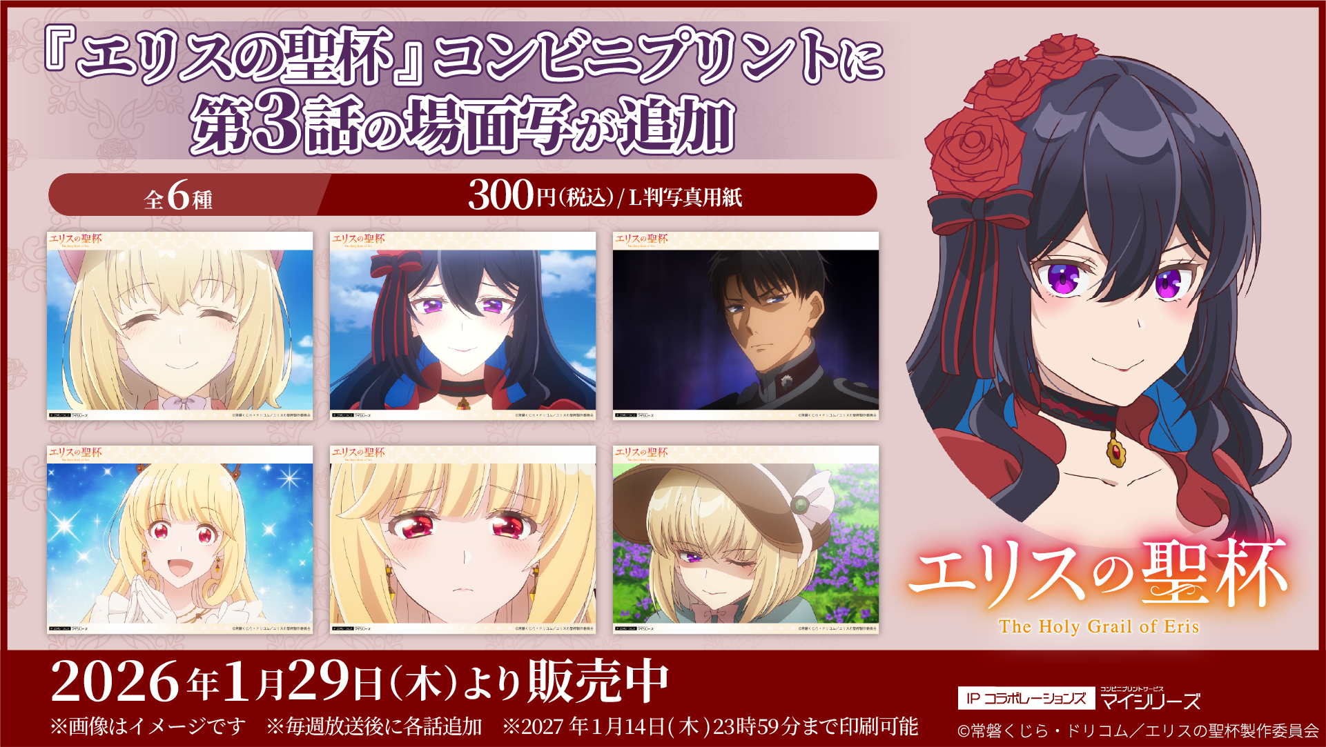 全国の対象コンビニで利用可能なプリントサービスとして提供中のTVアニメ『エリスの聖杯』コンビニプリントの「場面写」に第3話を追加しました。