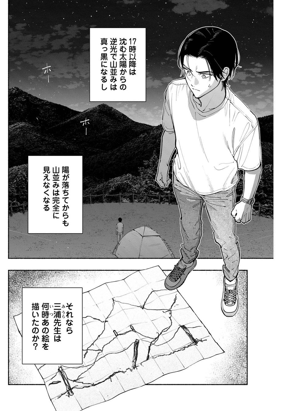 やがて、8合目にたどり着き「山並みの絵」と実際の風景を見比べてみると、ある“違和感”に気づく。それは、犯人が仕掛けたトリック、そして三浦がスケッチに込めた真意を解き明かす鍵だった。