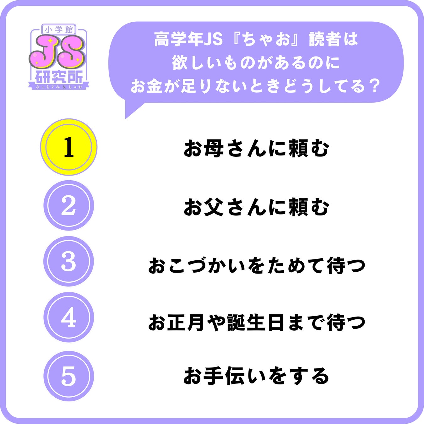 一方の高学年JSでも、「お母さんに頼む」(51.9%)、「お父さんに頼む」(32.1%)といった親御さんに助けを求める回答が大多数を占めていましたが、中には「いらないものを売る(フリマアプリやリサイクルなど)」や「フリマアプリで安いものを探す」、「手づくりしたものを売る(ビーズアクセサリーなど)」といった回答も見られ、フリマアプリなどでリユース市場が身近となったり、自ら作ったものを簡単に販売できるようになったりした環境変化がうかがえます。