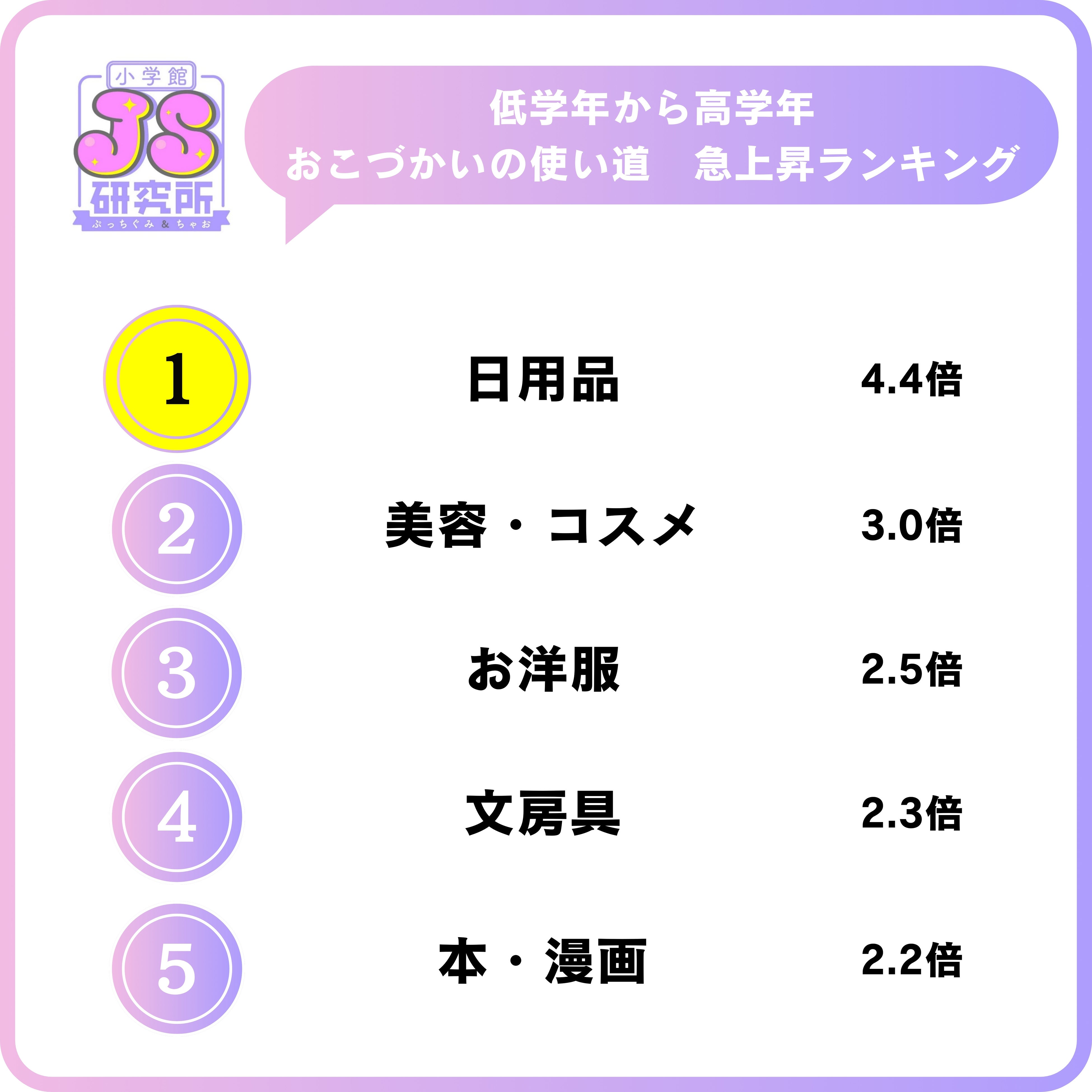 ~低学年から高学年の「おこづかいの使い道」急上昇ランキング1位「日用品」、2位「美容・コスメ」、3位「お洋服」~