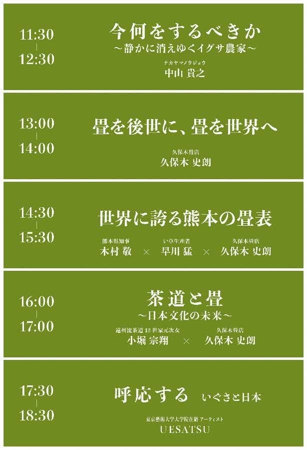 国内シェア90%以上を誇る熊本のいぐさ・畳文化の真価を、専門家の声とともに再発見できるトークイベントを行います。日本初の畳の体験型複合施設である「畳ビレッジ」や銀座で畳製品のショールームを展開する「久保木畳店」の久保木氏や、農林水産大臣賞最多5度受賞した、日本一のい草生産者である早川氏などをゲストにお招きします。また、いぐさ・畳の魅力を大型パネル等で紹介し、県内のいぐさ農家によるPRも併せて実施します。