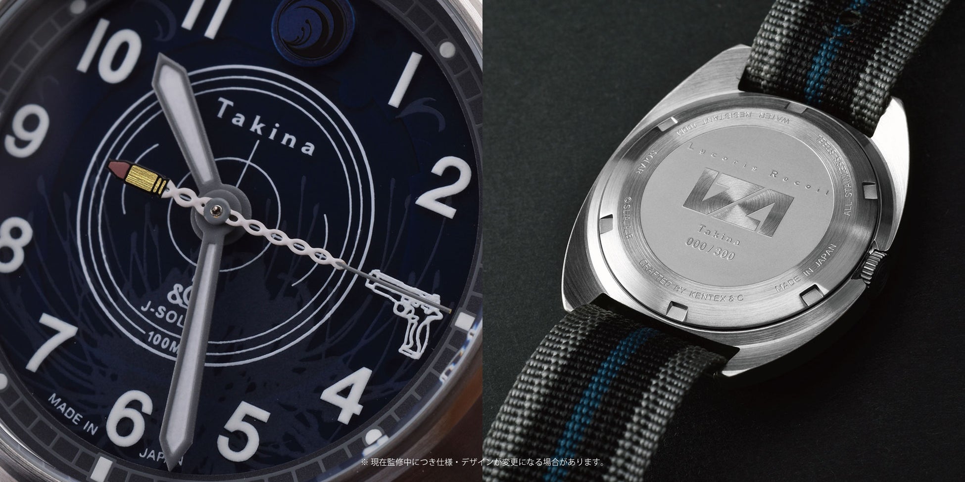 文字盤は、たきなのキャラクターカラーをイメージしたブルーを採用。12時の位置にはリコリス校章、3時の位置にはたきなの銃のシルエットをデザイン。秒針はたきなの弾丸を再現。文字盤3時の位置にデザインされた、たきなの銃シルエットと併せて楽しめるデザイン。裏蓋には、DAの刻印と共にTakinaの文字と限定300本生産のシリアルナンバーを刻印。