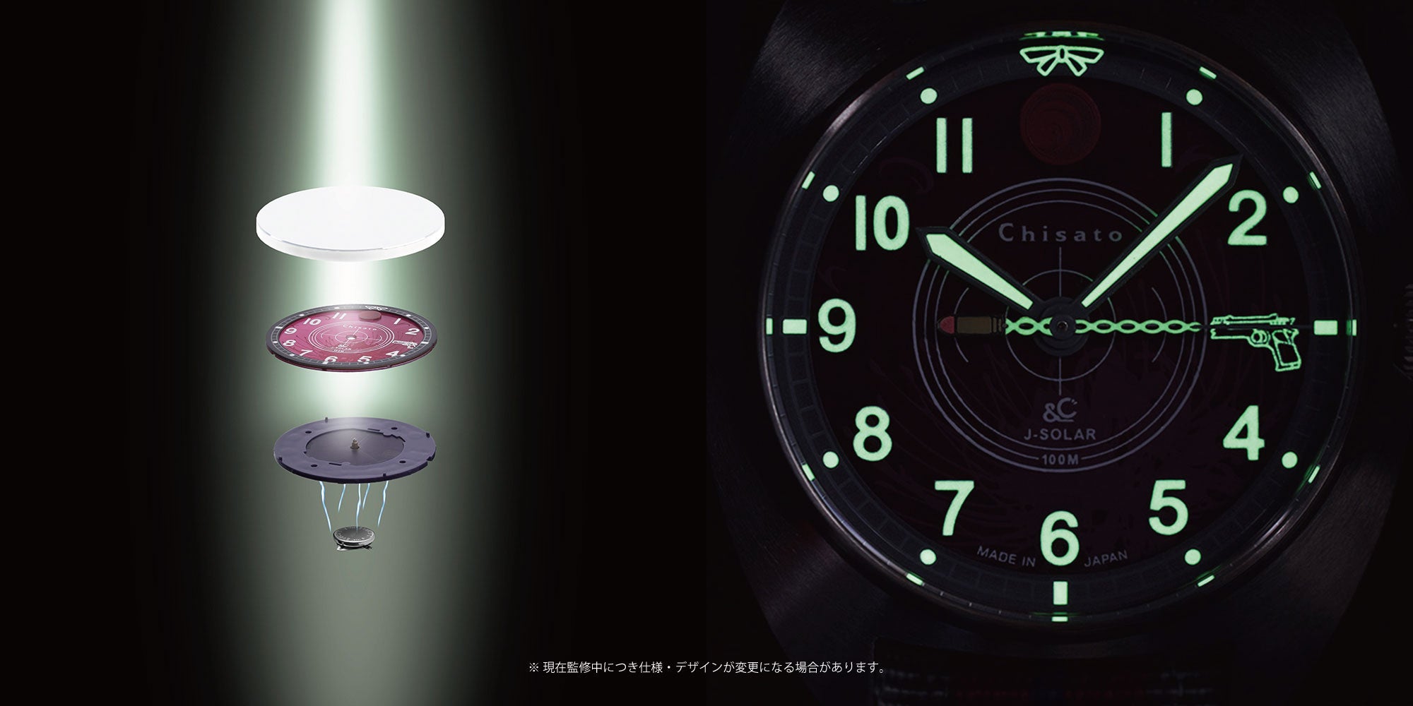 文字盤は、千束のキャラクターカラーをイメージしたレッドを採用。12時の位置にはリコリス校章、3時の位置には千束の銃のシルエットをデザイン。秒針は千束の非殺傷弾をイメージ。文字盤3時の位置にデザインされた、千束の銃シルエットと併せて楽しめるデザイン。裏蓋には、DAの刻印と共にChisatoの文字と限定300本生産のシリアルナンバーを刻印。