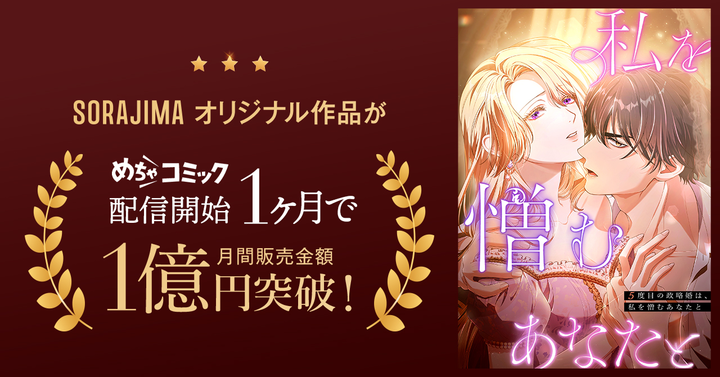 SORAJIMA第一編集部が手掛けるオリジナル作品『5度目の政略婚は、私を憎むあなたと』は、電子コミック配信サービス「めちゃコミック(めちゃコミ)」にて独占先行配信中の作品として、2025年12月26日の配信開始以降、わずか1か月で売上1億円を突破しました。本作品は、SORAJIMAが手がけるオリジナル作品の中でも、極めて順調な立ち上がりを見せており、短期間での売上達成は、本作に対する関心の高まりを示すものといえます。