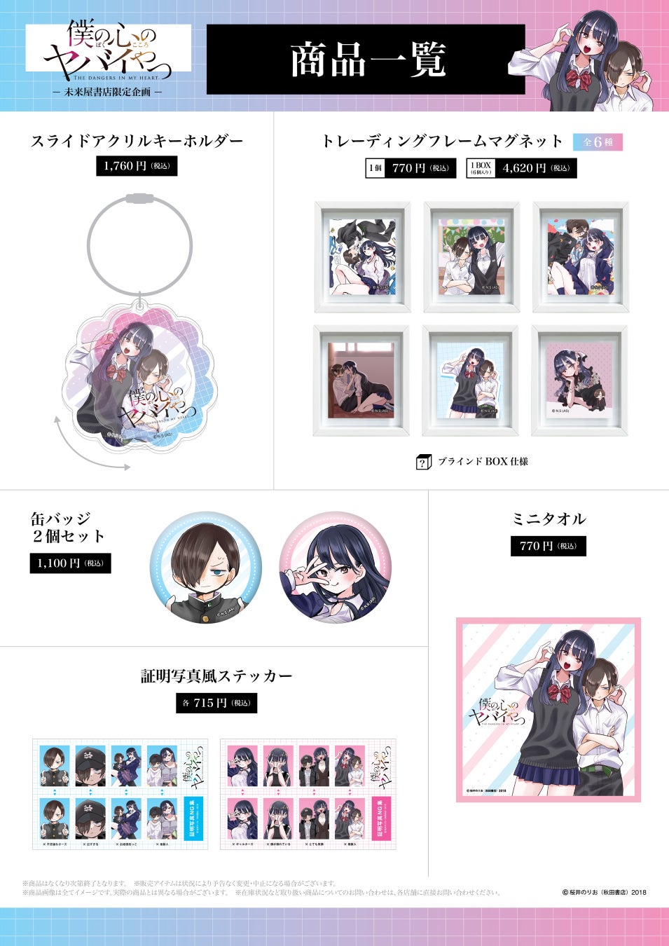 『僕の心のヤバイやつ』の新グッズが未来屋書店で限定発売されます!アイテムは、スライドアクリルキーホルダー、トレーディングフレームマグネット(全6種・ランダム商品)、缶バッジ2個セット、証明写真風ステッカー(2種)、ミニタオルの全5アイテムです。