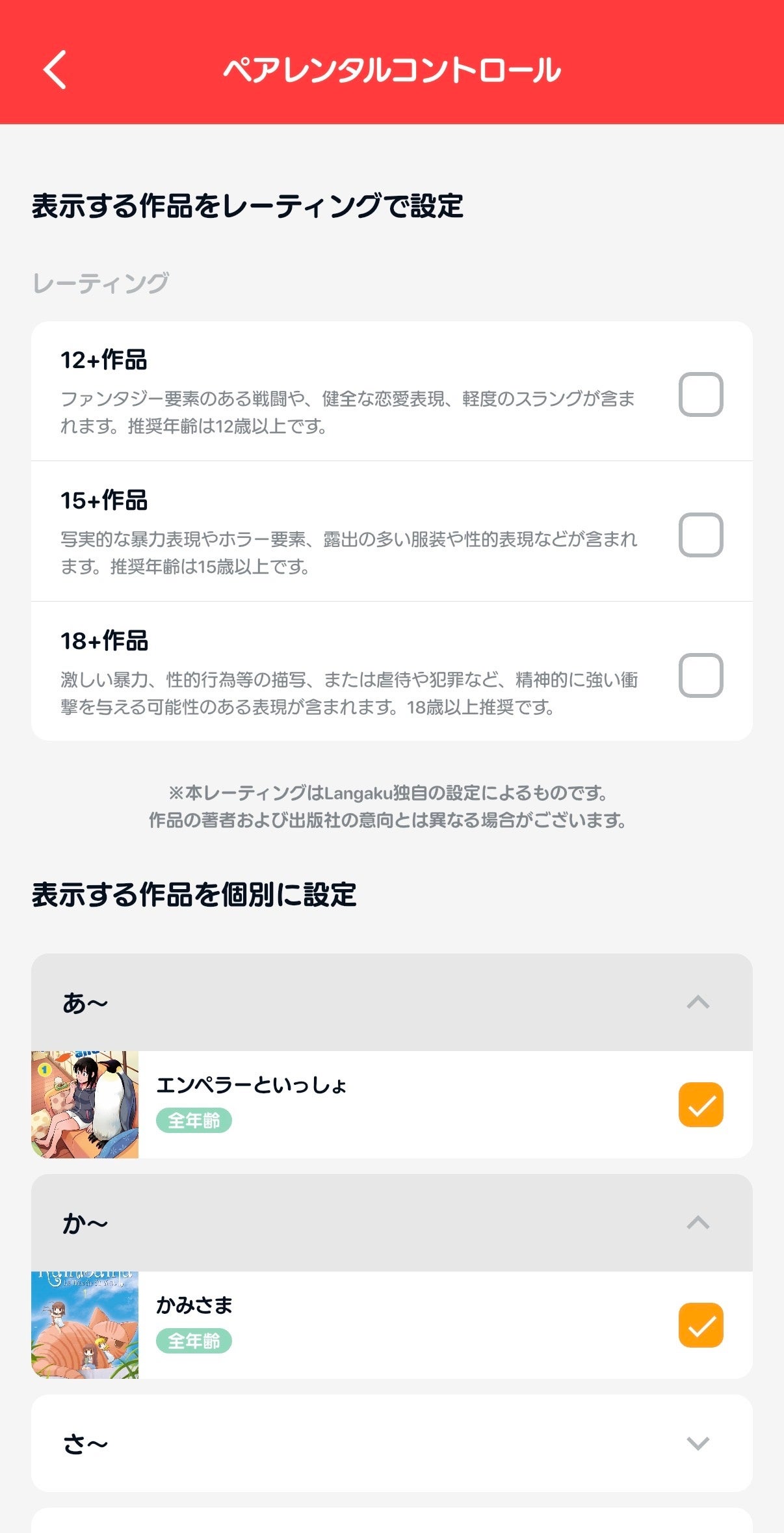 すべての作品に年齢目安の『Langaku』独自のレーティングを設定し、12+(12歳以上推奨)、15+(15歳以上推奨)、18+(18歳以上推奨)といったレーティング単位、ならびに作品ごとに、表示・非表示の設定が可能です。
