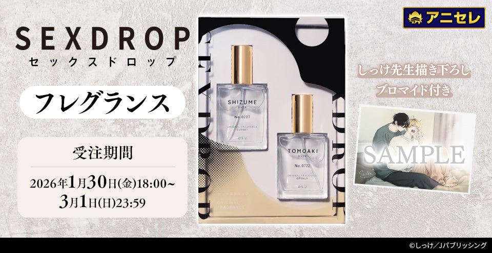 『animate LIMITED SELECTION(アニセレ)』とは、アニメ・コミック・ゲームの専門店「アニメイト」が様々なグッズメーカーと共同で商品を企画、アニメイトでしか手に入らないプレミアムなアニメイト限定商品をお客様へお届けするプロジェクトです。2026年5月に発売を予定している『セックスドロップ』のフレグランスは、黒木鎮と黄海知昭をそれぞれイメージした2本セットで、しっけ先生描き下ろしブロマイド付きです。全国アニメイト・アニメイト通販にて2026年3月1日まで受注受付を行っております。