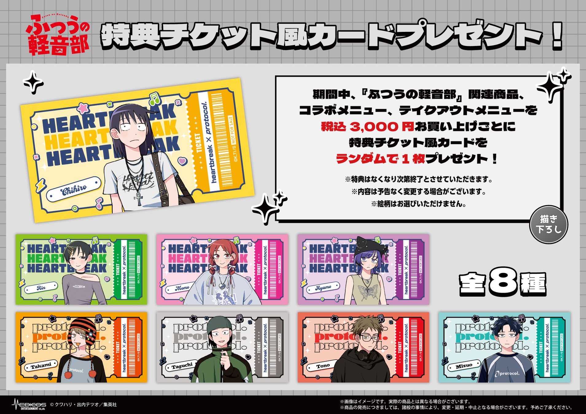 「ふつうの軽音部」関連商品、コラボメニュー、テイクアウトメニューを3,000円(税込)ご購入ごとに特典チケット風カードをランダムで1枚お渡しします。
