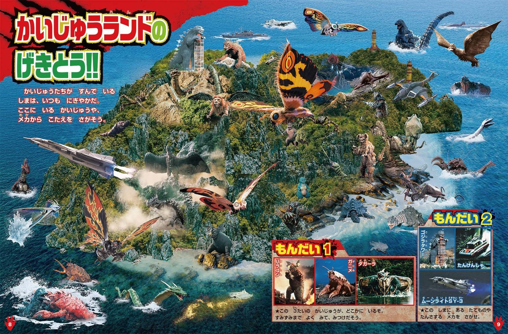 炎に包まれた大都会や、怪獣たちの棲む小島、まさに噴火中の火山のふもと、原始林の生い茂ったジャングル、怪獣やスーパーメカが争い乱れる海底、そして宇宙怪獣が戦う惑星など、さまざまな場所を舞台にゴジラたちが暴れまわっています。ただ眺めているだけでも楽しいこれらのシーンから、お目当ての1体を探し当ててください。