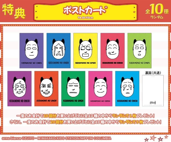 一度のお会計で10回分ご購入ごとに特典ポストカード(全10種)の中からランダムで1枚、20回分ご購入ごとにランダムで5枚プレゼント!