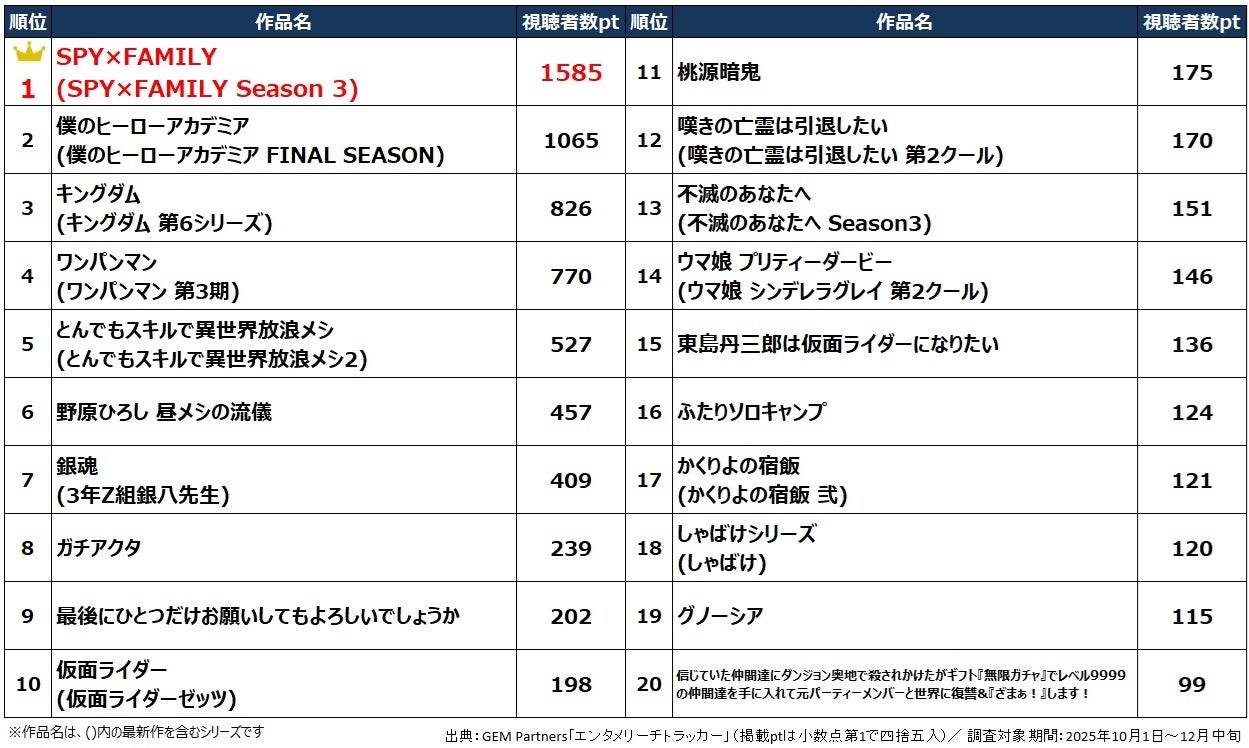 視聴者数ランキングでは『SPY×FAMILY Season 3』が首位に!