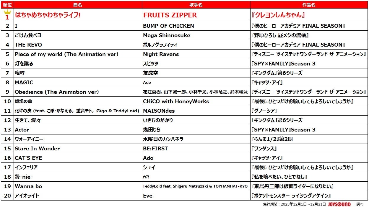 株式会社エクシングは、業務用通信カラオケ「JOYSOUND」において、2025年10月クールの秋アニメ作品の関連曲を対象に、カラオケの歌唱回数に基づく「2025年 秋アニメ主題歌 カラオケランキング」を発表しました。