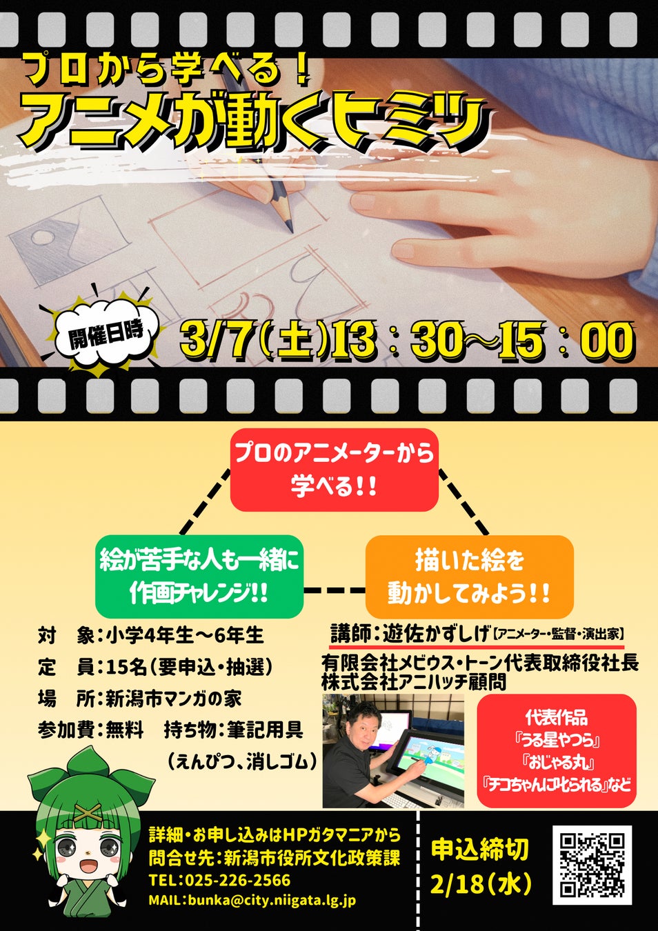 専門道具や専門知識は必要なし。絵が得意な人もそうでない人も楽しめる講座内容です!アニメを見るのが好きな小学4年生から6年生のみなさん、たくさんのご応募をお待ちしております!