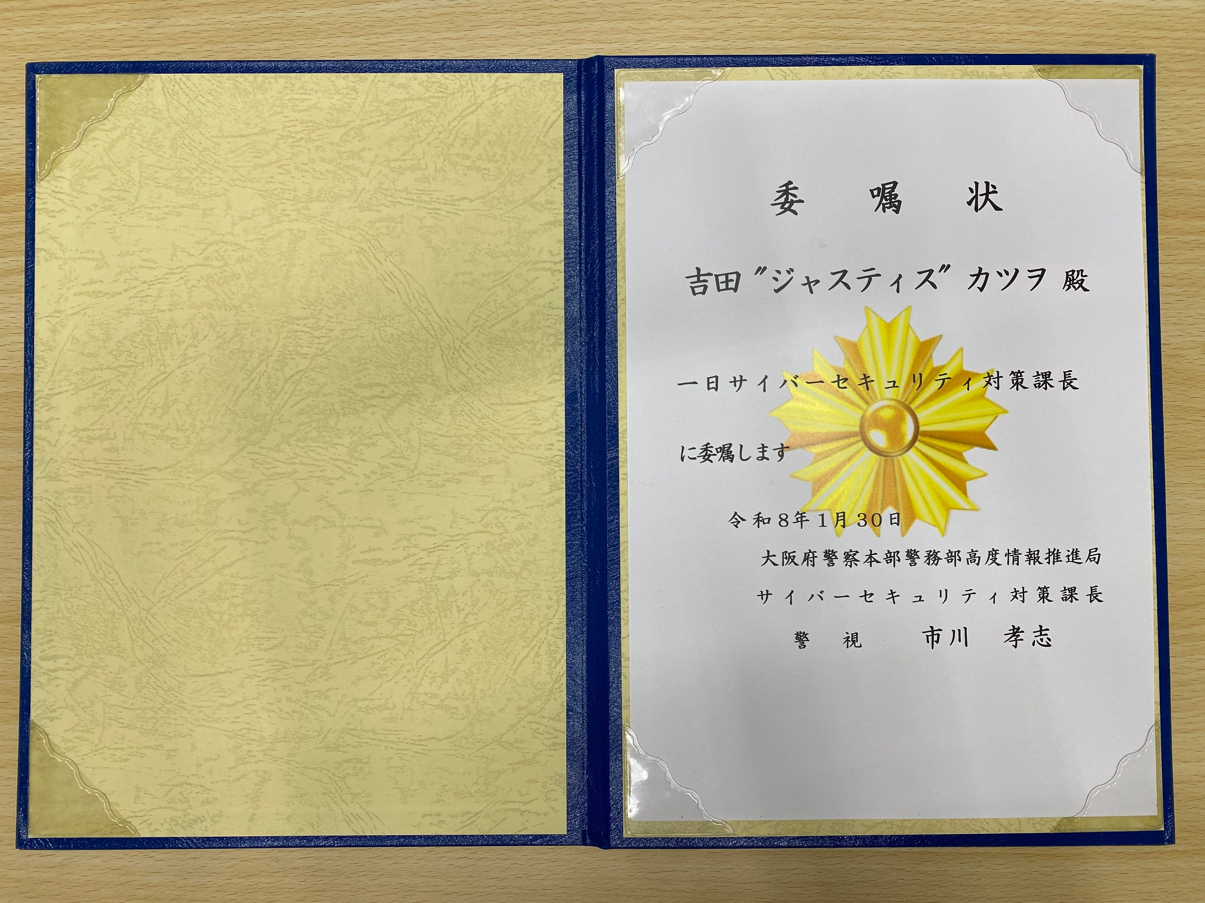 啓発イベントの冒頭で、大阪府警察本部から「吉田くん」へ、「1日サイバーセキュリティ対策課長」の委嘱状が交付されました。