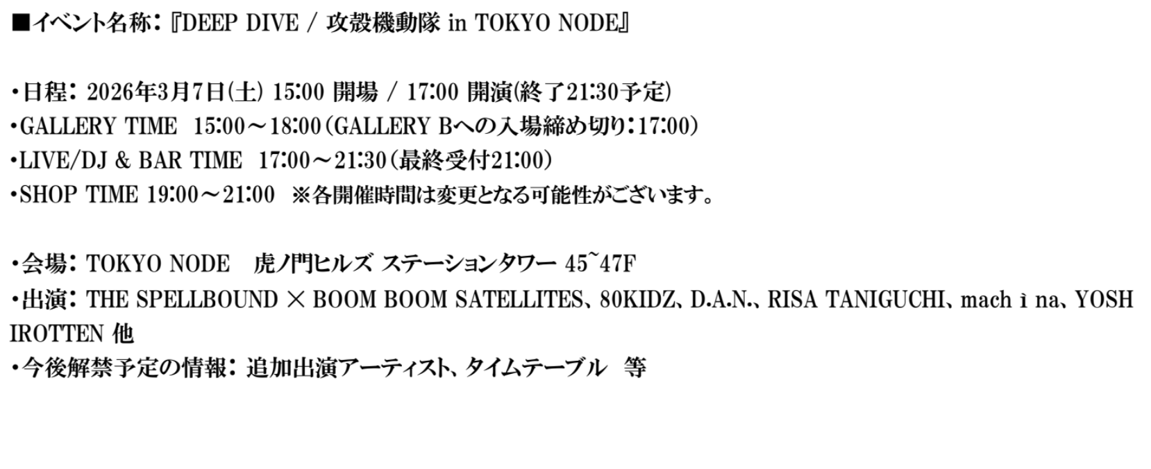 攻殻機動隊展 Ghost and the Shell 製作委員会(株式会社講談社、森ビル株式会社、KDDI株式会社、株式会社プロダクション・アイジー、株式会社パルコ、株式会社バンダイナムコフィルムワークス)は、2026年1月30日(金)から4月5日(日)まで、虎ノ門ヒルズ ステーションタワー45Fの情報発信拠点「TOKYO NODE(東京ノード)」内 TOKYO NODE GALLERY にて開催する『攻殻機動隊展 Ghost and the Shell』内で開催されます、作品公式の音楽イベント『DEEP DIVE / 攻殻機動隊 in TOKYO NODE』の情報解禁第二弾として、出演アーティスト第一弾およびイベント特別キービジュアル、チケット詳細を公開いたしました。