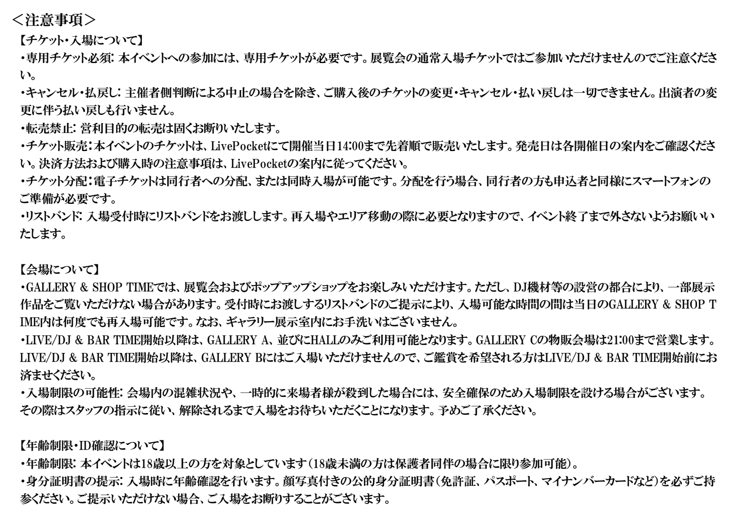 本イベントのチケットは、2026年2月3日(火)17:00よりLivePocketにて販売を開始いたします。 同会場で開催される展覧会も楽しめるお得なセットチケットをご用意しております。