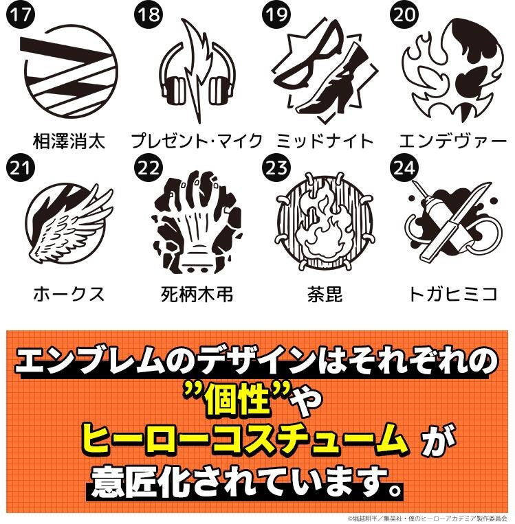エンブレムのデザインは、緑谷出久や爆豪勝己、麗日お茶子、轟焦凍に、オールマイト、相澤消太、エンデヴァー、ホークス、死柄木弔や荼毘、トガヒミコなど24種類。マークをみればそのキャラクターが彷彿とされるようなデザインになっています。