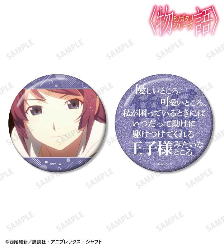 戦場ヶ原ひたぎ、八九寺真宵、神原駿河、千石撫子、羽川翼、阿良々木暦、阿良々木月火、阿良々木火憐、忍野メメ、忍野忍、忍野扇、斧乃木余接の印象的なシーンを、オーロラ加工を施した缶バッジに仕上げました。