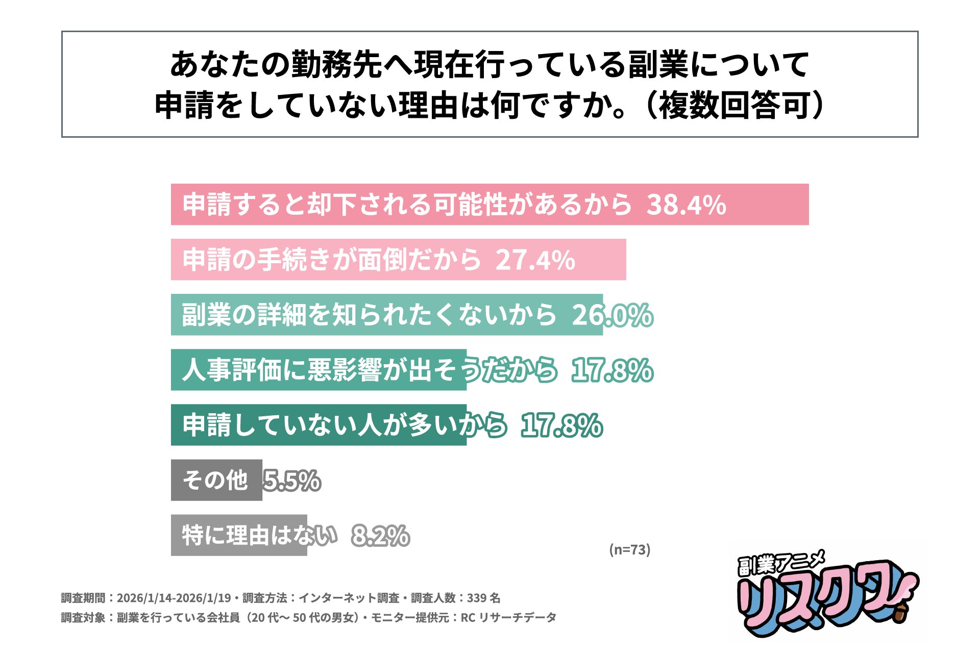 本調査の結果から、勤務先の副業可否を認識して副業を行っている会社員の約3人に1人が、勤務先の副業に関する制度に不満があることが判明しました。さらに、副業を行う際は勤務先への申請が必要な人の約半数が、現在行っている副業について一部または全てを申請しておらず、その理由は「申請すると却下される可能性があること」や「申請の手続きが面倒な点」であることが明らかになりました。このような会社の制度が障壁となり副業への一歩を踏み出せない状況などの実態を、副業アニメ「リスクワ」は、楽しいコンテンツとして提供しています。本サービスは、副業のリアルな会話劇を描くアニメーションシリーズで、YouTubeやTikTokで気軽に視聴できる配信形式を採用しています。共感性の高いストーリーにより、副業を行っている人やこれから副業を行いたい人に実践的なヒントを提供します。