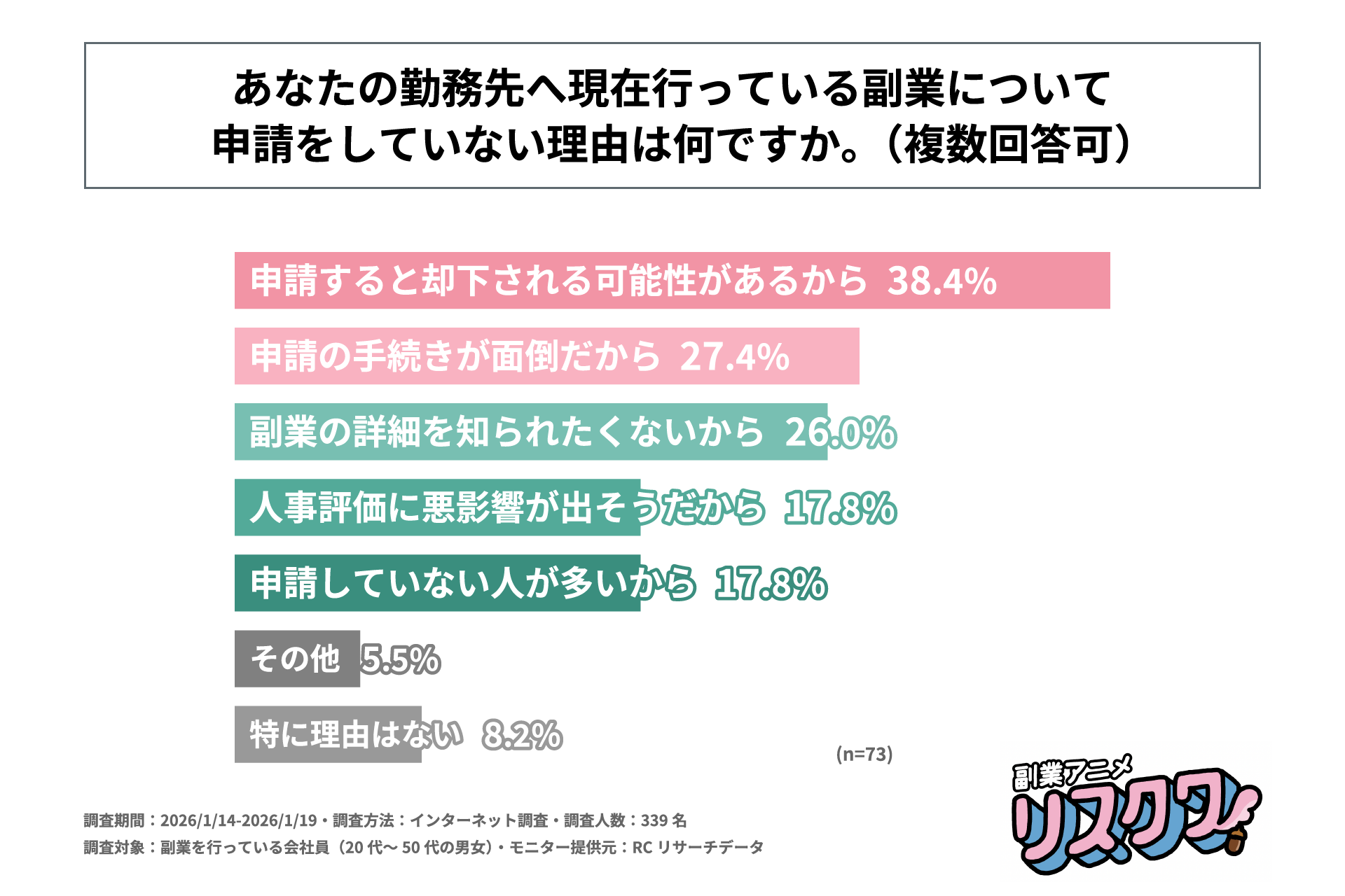 株式会社事業家集団(本社:東京都千代田区、代表取締役:田辺 由美子)が運営する「リスクワ」は、副業を行っている会社員(20代~50代の男女)を対象に「副業に関する企業の制度と会社員の実態調査」を実施しました。この調査から、副業を行っている会社員の勤務先における副業制度の実態やその制度に対する意識、副業が本業に与える好影響などが明らかになりました。