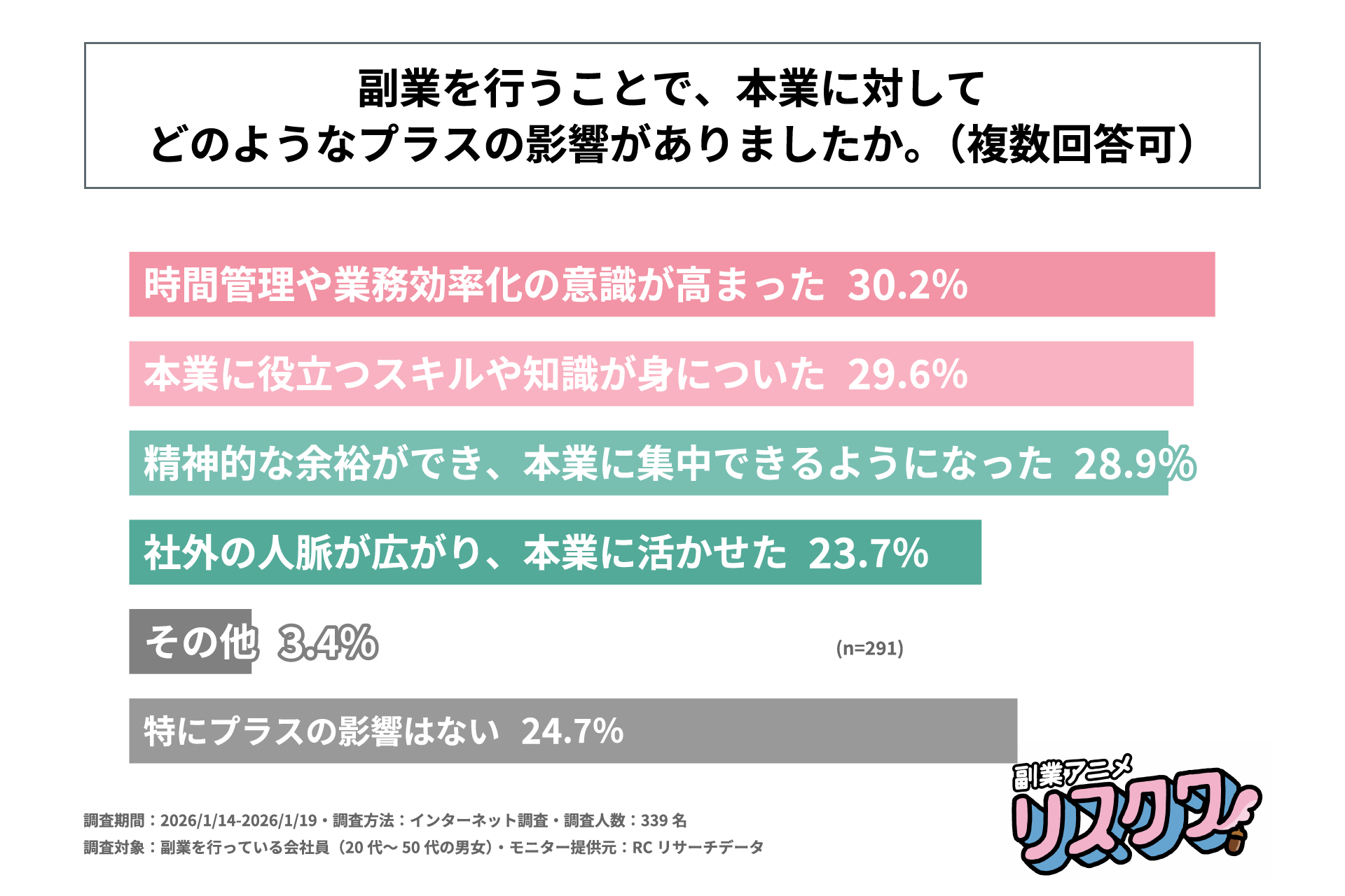 調査の最後、勤務先の副業可否を認識して副業を行っている会社員を対象に「副業を行うことで、本業に対してどのようなプラスの影響があったか」を尋ねる設問への回答では、1位が「時間管理や業務効率化の意識が高まった」で30.2%、2位が「本業に役立つスキルや知識が身についた」で29.6%、3位が「精神的な余裕ができ、本業に集中できるようになった」で28.9%という結果になりました。この結果から、勤務先の副業制度を把握し副業を行っている会社員の多くが、時間管理や業務効率化といった意識の向上に加え、本業に役立つスキルや知識の習得、さらには精神的な余裕が生まれるといったプラスの影響を実感していることがわかりました。