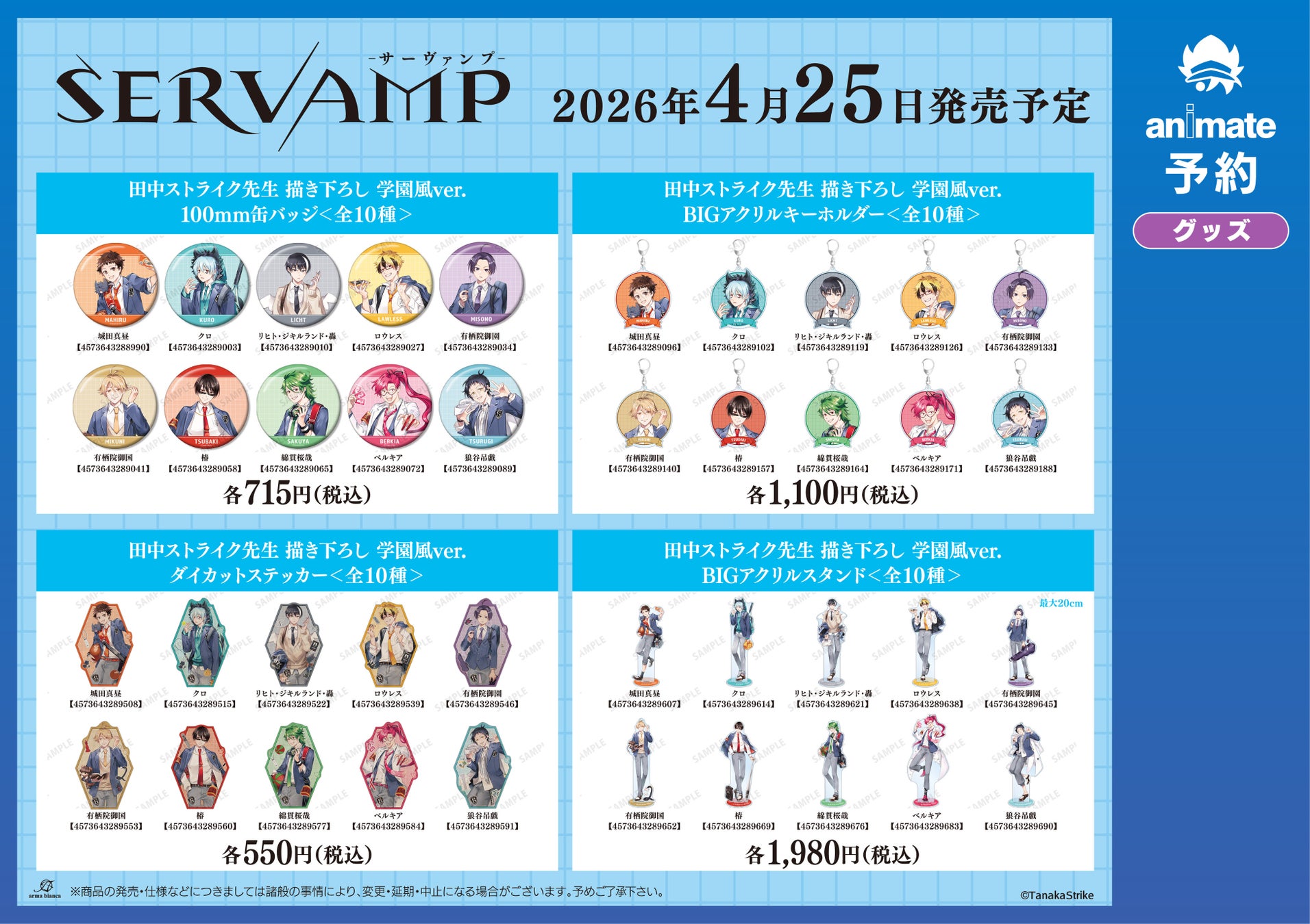 今回のフェアでは、田中ストライク先生による『SERVAMP-サーヴァンプ-』の「学園風」をコンセプトにした新規描き下ろしイラストを使用した新商品を多数先行販売する他、フェア特典を予定しております。
